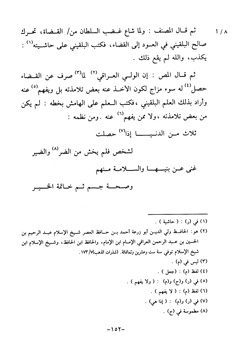ثمَّ قَالَ المص: إِن الْوَلِيّ الْعِرَاقِيّ لما صرف عَن الْقَضَاء حصل لَهُ سوء مزاج لكَون الْأَخْذ عَنهُ بعض تلامذته بل وَيفهم عَنهُ وَأَرَادَ بذلك الْعلم البُلْقِينِيّ، فَكتب الْعلم على الْهَامِش بِخَطِّهِ: لم يكن من بعض تلامذته، وَلَا مِمَّن يفهم عَنهُ. وَمن نظمه: