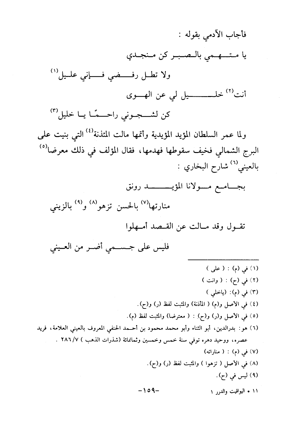 وَلما عمر السُّلْطَان الْمُؤَيد المؤيدية وأتمها مَالَتْ المئذنة الَّتِي بنيت على البرج الشمالي فخيف سُقُوطهَا فَهَدمهَا، فَقَالَ الْمُؤلف فِي ذَلِك معرضًا بالعيني شَارِح البُخَارِيّ: