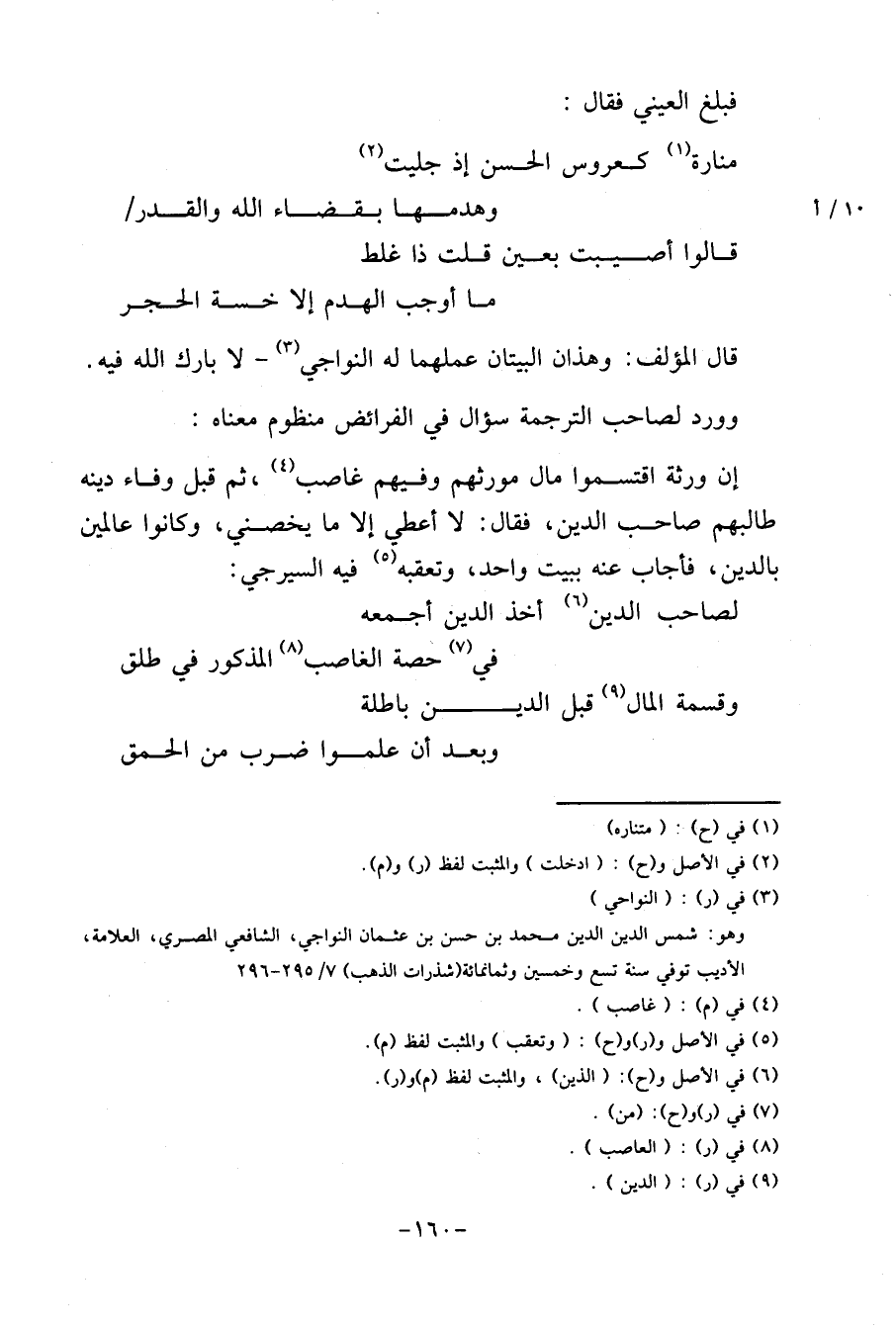 إِن وَرَثَة اقتسموا مَال مُورثهم وَفِيهِمْ غَاصِب، ثمَّ قبل وَفَاء دينه طالبهم صَاحب الدّين، فَقَالَ: لَا أعطي إِلَّا مَا يخصني، وَكَانُوا عَالمين بِالدّينِ، فَأجَاب عَنهُ بِبَيْت وَاحِد، وَتعقبه فِيهِ السيرجي: