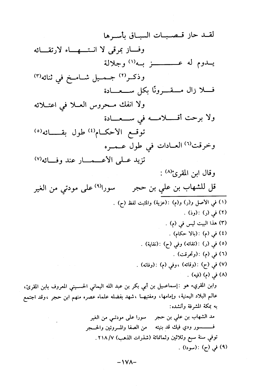 (قل لِلشِّهَابِ بن عَليّ بن حجر ... سورا على مودتي من الْغَيْر)