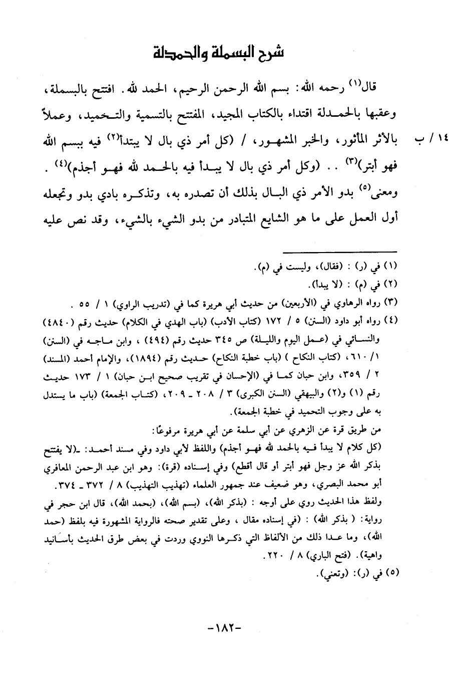 قَالَ رَحمَه الله: بِسم الله الرَّحْمَن الرَّحِيم، الْحَمد الله. افْتتح بالبسملة، وعقبها بالحمدلة اقْتِدَاء بِالْكتاب الْمجِيد، المفتتح بِالتَّسْمِيَةِ والتحميد، وَعَملا بالأثر الْمَأْثُور، وَالْخَبَر الْمَشْهُور، / (كل أَمر ذِي لَا يبتدأ فِيهِ بِسم الله فَهُوَ أَبتر) . . (وكل أَمر ذِي بَال لَا يبْدَأ فِيهِ بِالْحَمْد لله فَهُوَ أَجْذم) .