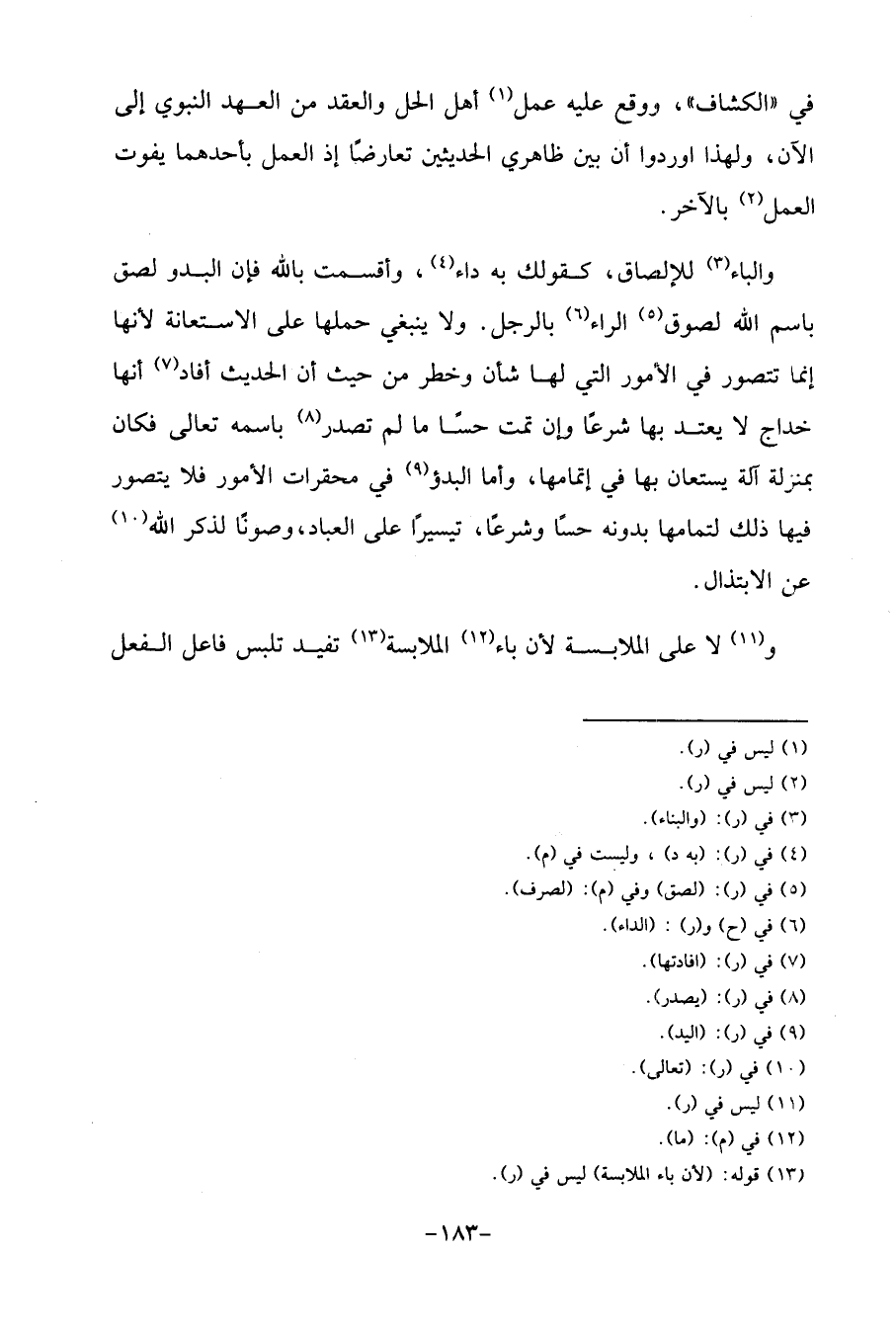 وَالْبَاء للإلصاق، كَقَوْلِك بِهِ دَاء، وَأَقْسَمت بِاللَّه فَإِن البدو لصق باسم الله لصوق الرَّاء بِالرجلِ. وَلَا يَنْبَغِي حملهَا على الِاسْتِعَانَة لِأَنَّهَا إِنَّمَا تتَصَوَّر فِي الْأُمُور الَّتِي لَهَا شَأْن وخطر من حَيْثُ أَن الحَدِيث أَفَادَ أَنَّهَا خداج لَا يعْتد بهَا شرعا وَإِن تمت حسا مَا لم تصدر باسمه تَعَالَى فَكَانَ بِمَنْزِلَة آله يستعان بهَا فِي إِتْمَامهَا، وَأما البدؤ فِي محقرات الْأُمُور فَلَا يتَصَوَّر فِيهَا ذَلِك لتمامها بِدُونِهِ حسا وَشرعا، تيسيراً على الْعباد، وصوناً لذكر الله عَن الابتذال.