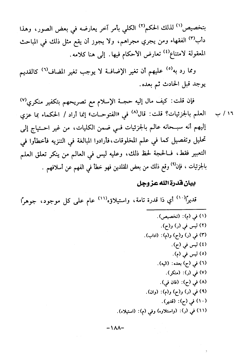 فَإِن قلت: كَيفَ مَال إِلَيْهِ حجَّة الْإِسْلَام مَعَ تصريحهم بتكفير منكري الْعلم بالجزئيات؟ قلت: قَالَ فِي " الفتوحات " إِنَّمَا أَرَادَ / الْحُكَمَاء بِمَا عزي إِلَيْهِم أَنه سُبْحَانَهُ عَالم بالجزئيات فِي ضمن الكليات، من غير احْتِيَاج إِلَى تَحْلِيل وتفصيل كَمَا فِي علم الْمَخْلُوقَات، فأرادوا الْمُبَالغَة فِي التَّنْزِيه فأخطأوا فِي التَّعْبِير فَقَط، فالحجة لحظ ذَلِك، وَعَلِيهِ لَيْسَ فِي الْعَالم من يُنكر تعلق الْعلم بالجزئيات، فَإِن وَقع ذَلِك من بعض المقلدين فَهُوَ خطأ فِي الْفَهم عَن أسلافهم.