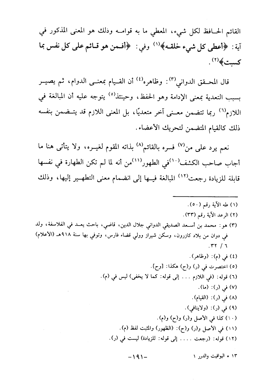 قَالَ الْمُحَقق الدواني: وَظَاهره أَن الْقيام بِمَعْنى الدَّوَام، ثمَّ يصير بِسَبَب التَّعْدِيَة بِمَعْنى الإدامة وَهُوَ الْحِفْظ، وَحِينَئِذٍ يتَوَجَّه عَلَيْهِ أَن الْمُبَالغَة فِي اللَّازِم رُبمَا تَتَضَمَّن معنى آخر مُتَعَدِّيا، بل الْمَعْنى اللَّازِم قد يتَضَمَّن بِنَفسِهِ ذَلِك كالقيام المتضمن لتحريك الْأَعْضَاء.