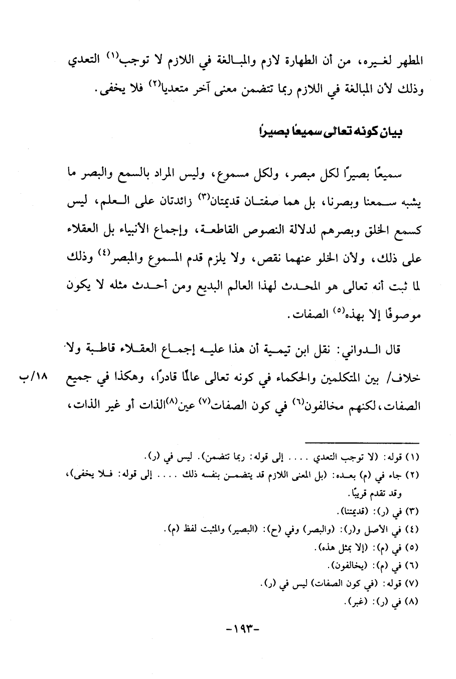 سميعاً بَصيرًا لكل مبصر، وَلكُل مسموع، وَلَيْسَ المُرَاد بِالسَّمْعِ وَالْبَصَر مَا يشبه سمعنَا وبصرنا، بل هما صفتان قديمتان زائدتان على الْعلم، لَيْسَ كسمع الْخلق وبصرهم لدلَالَة النُّصُوص القاطعة، وَإِجْمَاع الْأَنْبِيَاء بل الْعُقَلَاء على ذَلِك، وَلِأَن الْخُلُو عَنْهُمَا نقص، وَلَا يلْزم قدم المسموع والمبصر وَذَلِكَ لما ثَبت أَنه تَعَالَى هُوَ الْمُحدث لهَذَا الْعَالم البديع وَمن أحدث مثله لَا يكون مَوْصُوفا إِلَّا بِهَذِهِ الصِّفَات.