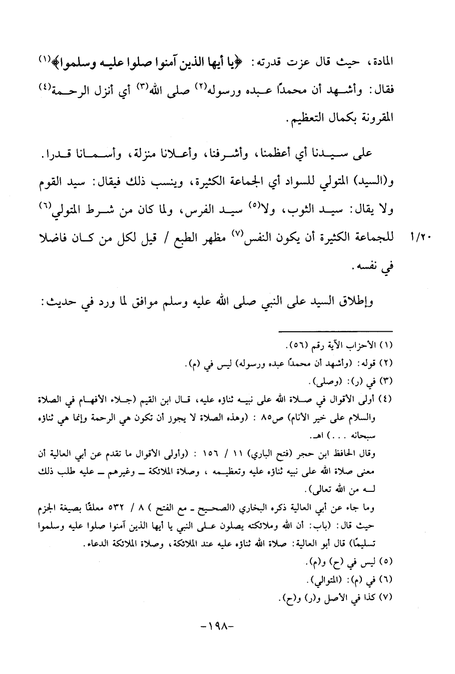 الْمَادَّة، حَيْثُ قَالَ عزت قدرته: (يَا أَيهَا الَّذين آمنُوا صلوا عَلَيْهِ وسلموا) فَقَالَ: وَأشْهد أَن مُحَمَّدًا عَبده وَرَسُوله صلى الله أَي أنزل الرَّحْمَة المقرونة بِكَمَال التَّعْظِيم.