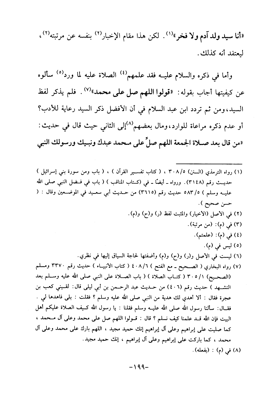وَأما فِي ذكره وَالسَّلَام عَلَيْهِ فقد علمهمْ الصَّلَاة عَلَيْهِ لما ورد سَأَلُوهُ عَن كيفيتها أجَاب بقوله: " قُولُوا اللَّهُمَّ صل على مُحَمَّد ". فَلم يذكر لفظ السَّيِّد، وَمن ثمَّ تردد ابْن عبد السَّلَام فِي أَن الْأَفْضَل ذكر السَّيِّد رِعَايَة للأدب؟ أَو عدم ذكره مُرَاعَاة للوارد، وَمَال بَعضهم إِلَى الثَّانِي حَيْثُ قَالَ فِي حَدِيث: " من قَالَ بعد صَلَاة الْجُمُعَة اللَّهُمَّ صلَّ على مُحَمَّد عَبدك وَنَبِيك وَرَسُولك النَّبِي