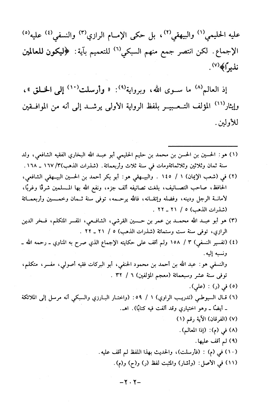 عَلَيْهِ الْحَلِيمِيّ وَالْبَيْهَقِيّ، بل حكى الإِمَام الرَّازِيّ والنسفي عَلَيْهِ الْإِجْمَاع. لَكِن انتصر جمع مِنْهُم السُّبْكِيّ للتعميم بِآيَة: (ليَكُون للْعَالمين نذيراً) .
