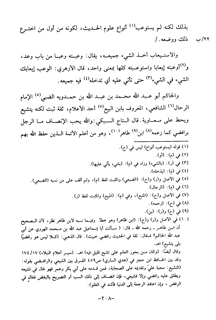 وَالْحَاكِم أَبُو عبد الله مُحَمَّد بن عبد الله بن حَمْدَوَيْه الضَّبِّيّ الإِمَام الرّحال الشَّافِعِي، الْمَعْرُوف بِابْن البيع أحد الْأَعْلَام، ثِقَة ثَبت لكنه يتشيع ويحط على مُعَاوِيَة. قَالَ التَّاج السُّبْكِيّ: وَالله يحب الْإِنْصَاف مَا الرجل برافضي كَمَا زَعمه ابْن طَاهِر، وَهُوَ من أعلم الْأَئِمَّة الَّذين حفظ الله بهم