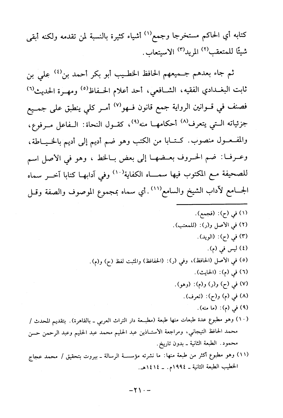 ثمَّ جَاءَ بعدهمْ جَمِيعهم الْحَافِظ الْخَطِيب أَبُو بكر أَحْمد بن عَليّ بن ثَابت الْبَغْدَادِيّ الْفَقِيه، الشَّافِعِي، أحد أَعْلَام الْحفاظ ومهرة الحَدِيث فصنف فِي قوانين الرِّوَايَة جمع قانون فَهُوَ أَمر كلي ينطبق على جَمِيع جزئياته الَّتِي يتعرف أَحْكَامهَا مِنْهُ، كَقَوْل النُّحَاة: الْفَاعِل مَرْفُوع، وَالْمَفْعُول مَنْصُوب. كتابا من الْكتب وَهُوَ ضم أَدِيم إِلَى أَدِيم بالخياطة، وَعرفا: ضم الْحُرُوف بَعْضهَا إِلَى بعض بالخط، وَهُوَ فِي الأَصْل اسْم للصحيفة مَعَ الْمَكْتُوب فِيهَا سَمَّاهُ الْكِفَايَة وَفِي آدابها كتابا آخر سَمَّاهُ الْجَامِع لِآدَابِ الشَّيْخ وَالسَّامِع. أَي سَمَّاهُ بِمَجْمُوع الْمَوْصُوف وَالصّفة وَقل الْجَامِع لِآدَابِ الشَّيْخ وَالسَّامِع. أَي سَمَّاهُ بِمَجْمُوع الْمَوْصُوف وَالصّفة وَقل