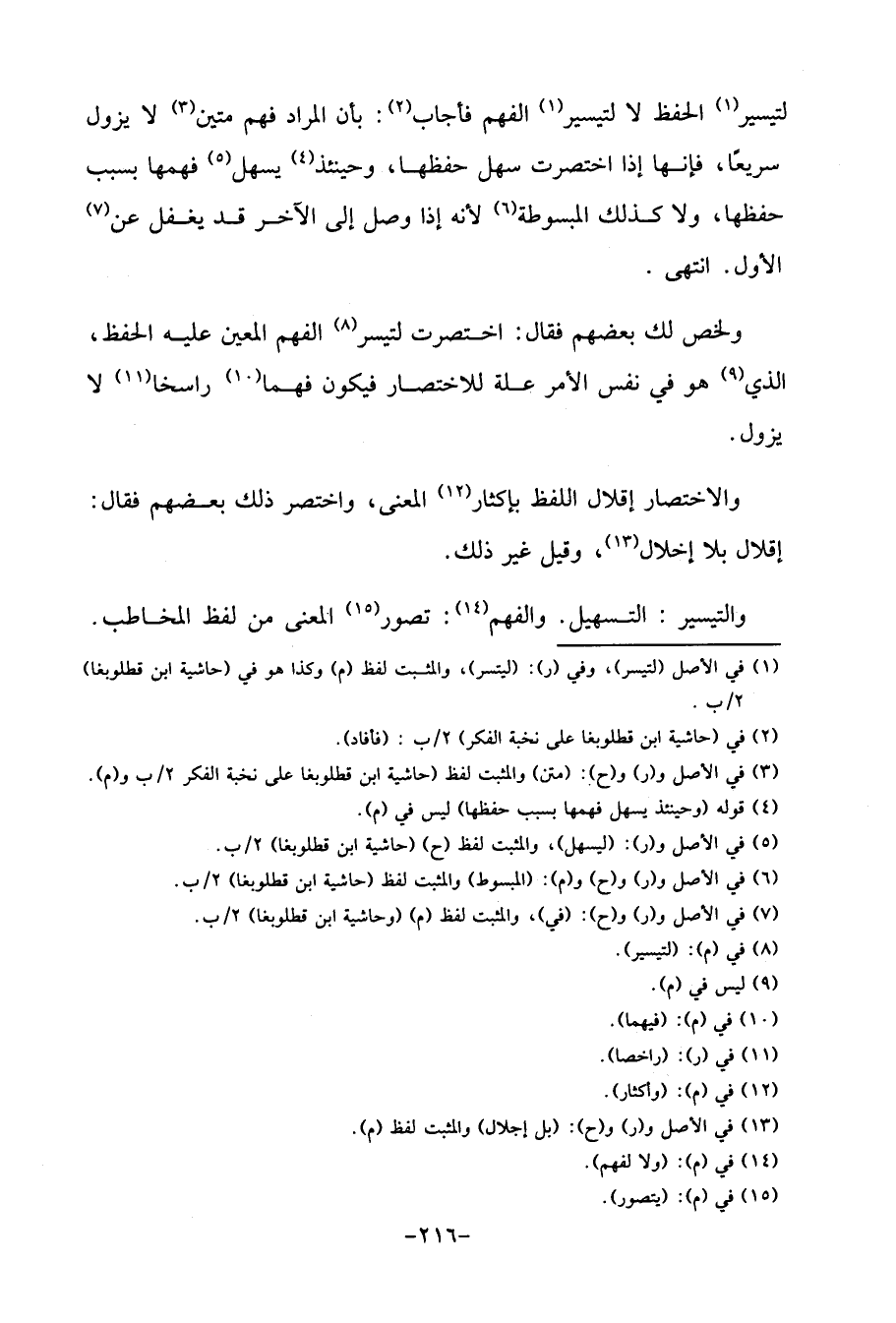 لتيسير الْحِفْظ لَا لتيسير الْفَهم فَأجَاب: بِأَن المُرَاد فهم متين لَا يَزُول سَرِيعا، فَإِنَّهَا إِذا اختصرت سهل حفظهَا، وَحِينَئِذٍ يسهل فهمها بِسَبَب حفظهَا، وَلَا كَذَلِك المبسوطة لِأَنَّهُ إِذا وصل إِلَى الآخر قد يغْفل عَن الأول. انْتهى.