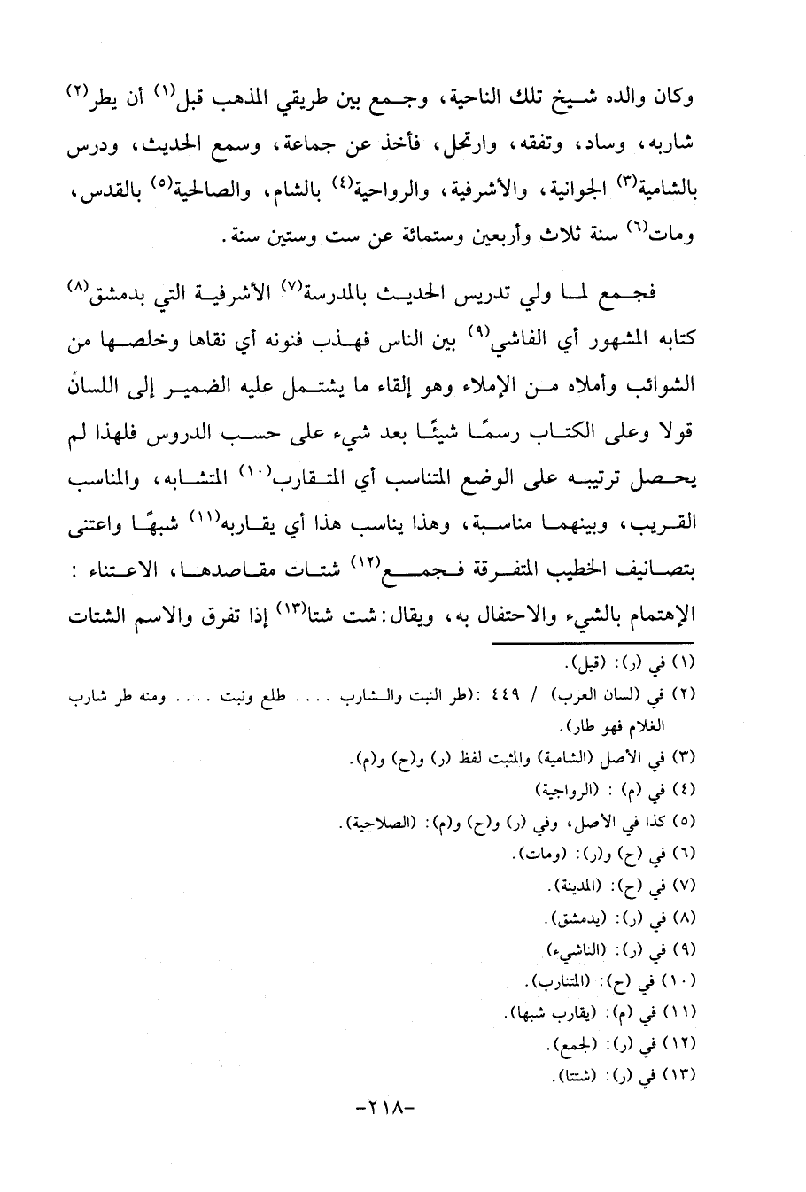 فَجمع لما ولي تدريس الحَدِيث بِالْمَدْرَسَةِ الأشرفية الَّتِي بِدِمَشْق كِتَابه الْمَشْهُور أَي الفاشي بَين النَّاس فهذب فنونه أَي نقاها وخلصها من الشوائب وأملاه من الْإِمْلَاء وَهُوَ إِلْقَاء مَا يشْتَمل عَلَيْهِ الضَّمِير إِلَى اللِّسَان قولا وعَلى الْكتاب رسماً شَيْئا بعد شَيْء على حسب الدُّرُوس فَلهَذَا لم يحصل ترتيبه على الْوَضع المتناسب أَي المتقارب الْمُتَشَابه، وَالْمُنَاسِب الْقَرِيب، وَبَينهمَا مُنَاسبَة، وَهَذَا يُنَاسب هَذَا أَي يُقَارِبه شبها واعتنى بتصانيف الْخَطِيب المتفرقة فَجمع شتات مقاصدها، الاعتناء: الإهتمام بالشَّيْء والاحتفال بِهِ، وَيُقَال: شت شتا إِذا تفرق وَالِاسْم الشتات