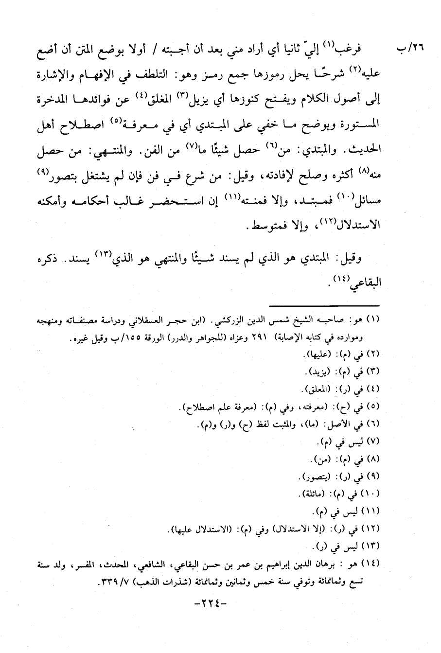 فَرغب إِلَى ثَانِيًا أَي أَرَادَ مني بعد أَن أَجَبْته / أَولا بِوَضْع الْمَتْن أَن أَضَع عَلَيْهِ شرحاً يحل رموزها جمع رمز وَهُوَ: التلطف فِي الإفهام وَالْإِشَارَة إِلَى أصُول الْكَلَام وَيفتح كنوزها أَي يزِيل المغلق عَن فوائدها المدخرة المستورة ويوضح مَا خَفِي على الْمُبْتَدِي أَي فِي معرفَة اصْطِلَاح أهل الحَدِيث. والمبتدي: من حصل شَيْئا مَا من الْفَنّ. والمنتهي: من حصل مِنْهُ أَكْثَره وَصلح لإفادته، وَقيل: من شرع فِي فن فَإِن لم يشْتَغل بتصور مسَائِل فمبتد، وَإِلَّا فمنته إِن استحضر غَالب أَحْكَامه وَأمكنهُ الِاسْتِدْلَال، وَإِلَّا فمتوسط.