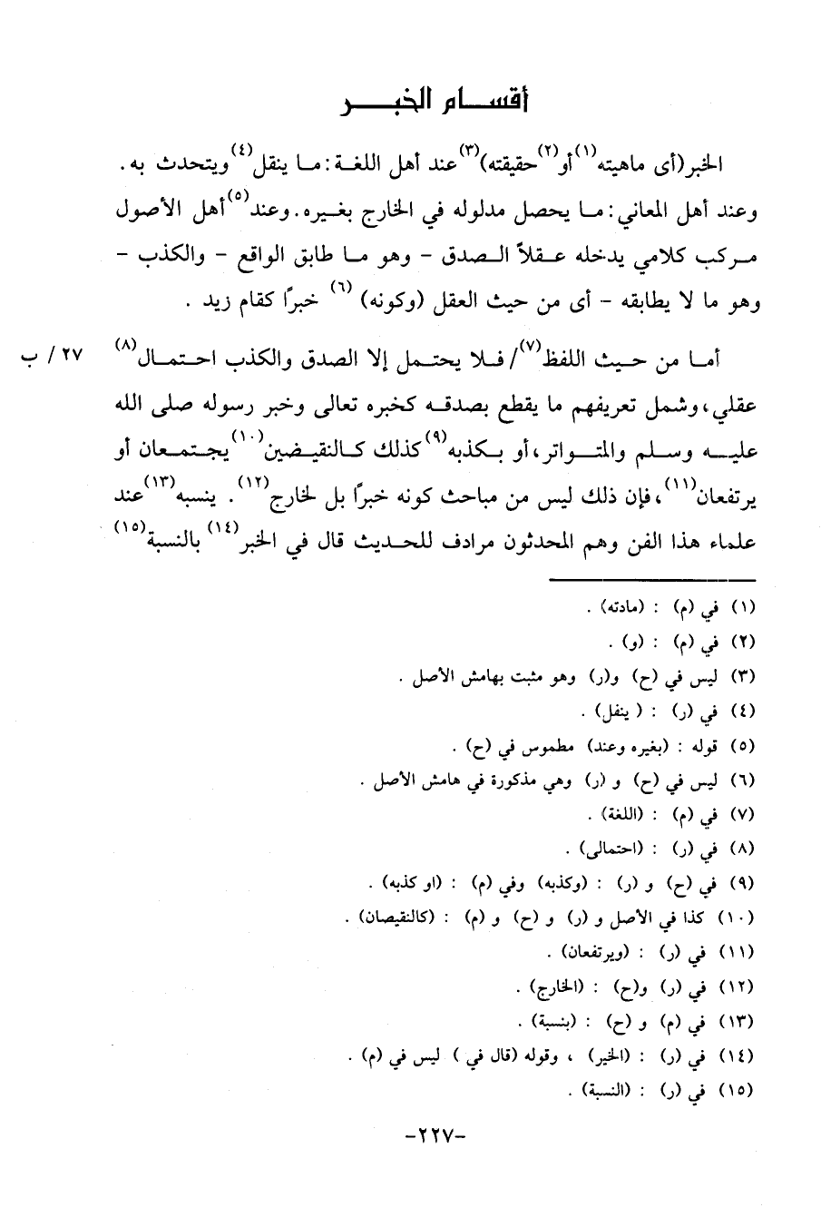 أما من حَيْثُ اللَّفْظ / فَلَا يحْتَمل إِلَّا الصدْق وَالْكذب احْتِمَال عَقْلِي، وَشَمل تعريفهم مَا يقطع بصدقه كخبره تَعَالَى وَخبر رَسُوله الله والمتواتر، أَو بكذبه كَذَلِك كالنقيضين يَجْتَمِعَانِ أَو يرتفعان، فَإِن ذَلِك لَيْسَ من مبَاحث كَونه خَبرا بل لخارج. ينْسبهُ عِنْد عُلَمَاء هَذَا الْفَنّ وهم المحدثون مرادف للْحَدِيث قَالَ فِي الْخَبَر بِالنِّسْبَةِ