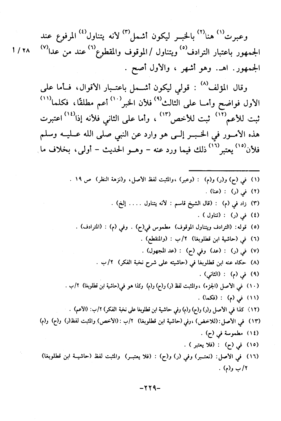 وعبرت هُنَا بالْخبر ليَكُون أشمل لِأَنَّهُ يتَنَاوَل الْمَرْفُوع عِنْد الْجُمْهُور بِاعْتِبَار الترادف ويتناول / الْمَوْقُوف والمقطوع عِنْد من عدا الْجُمْهُور. اه. وَهُوَ أشهر، وَالْأول أصح.