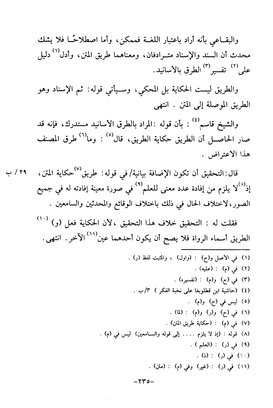 والبقاعي بِأَنَّهُ أَرَادَ بِاعْتِبَار اللُّغَة فممكن، وَأما اصْطِلَاحا فَلَا يشك مُحدث أَن السَّنَد والإسناد مُتَرَادِفَانِ، ومعناهما طَرِيق الْمَتْن، وأدل دَلِيل على تَفْسِير الطّرق بِالْأَسَانِيدِ.