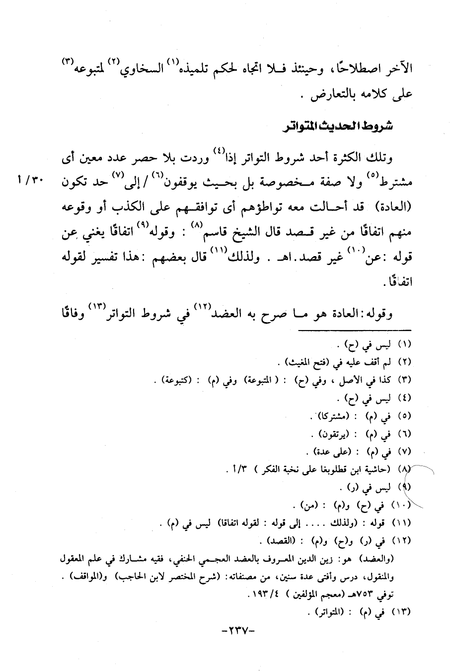 وَتلك الْكَثْرَة أحد شُرُوط التَّوَاتُر إِذا وَردت بِلَا حصر عدد معِين أَي مشترط وَلَا صفة مَخْصُوصَة بل بِحَيْثُ يوقفون / إِلَى حد تكون (الْعَادة) قد أحالت مَعَه تواطؤهم أَي توافقهم على الْكَذِب أَو وُقُوعه مِنْهُم اتِّفَاقًا من غير قصد قَالَ الشَّيْخ قَاسم: وَقَوله اتِّفَاقًا يُغني عَن قَوْله: عَن غير قصد. اه. وَلذَلِك قَالَ بَعضهم: هَذَا تَفْسِير لقَوْله اتِّفَاقًا.