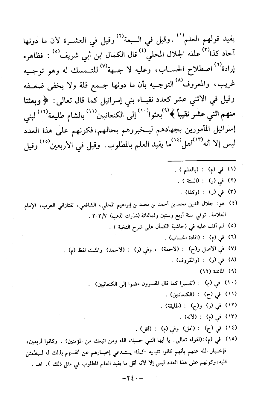 يُفِيد قَوْلهم الْعلم. وَقيل فِي السَّبْعَة وَقيل فِي الْعشْرَة لِأَن مَا دونهَا آحَاد كَذَا علله الْجلَال الْمحلي قَالَ الْكَمَال ابْن أبي شرِيف: فَظَاهره إِرَادَة اصْطِلَاح الْحساب، وَعَلِيهِ لَا جِهَة للتمسك لَهُ وَهُوَ تَوْجِيه غَرِيب، وَالْمَعْرُوف التَّوْجِيه بِأَن مَا دونهَا جمع قلَّة وَلَا يخفي ضعفه وَقيل فِي الاثْنَي عشر كعدد نقباء بني إِسْرَائِيل كَمَا قَالَ تَعَالَى: (وبعثنا مِنْهُم اثْنَي عشر نَقِيبًا) بعثوا إِلَى الكنعانيين بِالشَّام طَلِيعَة لبني إِسْرَائِيل المأمورين بجهادهم ليخبروهم بحالهم، فكونهم على هَذَا الْعدَد لَيْسَ إِلَّا أَنه أهل مَا يُفِيد الْعلم بالمطلوب. وَقيل فِي الْأَرْبَعين وَقيل