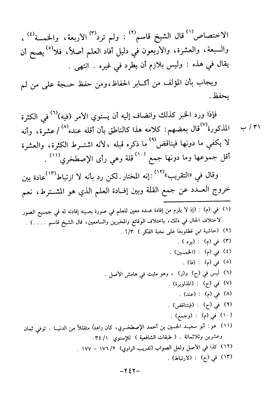 فَإِذا ورد الْخَبَر كَذَلِك وانضاف إِلَيْهِ أَن يَسْتَوِي الْأَمر (فِيهِ) فِي الْكَثْرَة الْمَذْكُورَة قَالَ بَعضهم: كَلَامه هَذَا كالناطق بِأَن أَقَله عِنْده / عشرَة، وَأَنه لَا يَكْفِي مَا دونهَا فيناقض مَا ذكره قبله، لِأَنَّهُ اشْترط الْكَثْرَة، وَالْعشرَة أقل جموعها وَمَا دونهَا جمع قلَّة وَهِي رأى الْإِصْطَخْرِي.