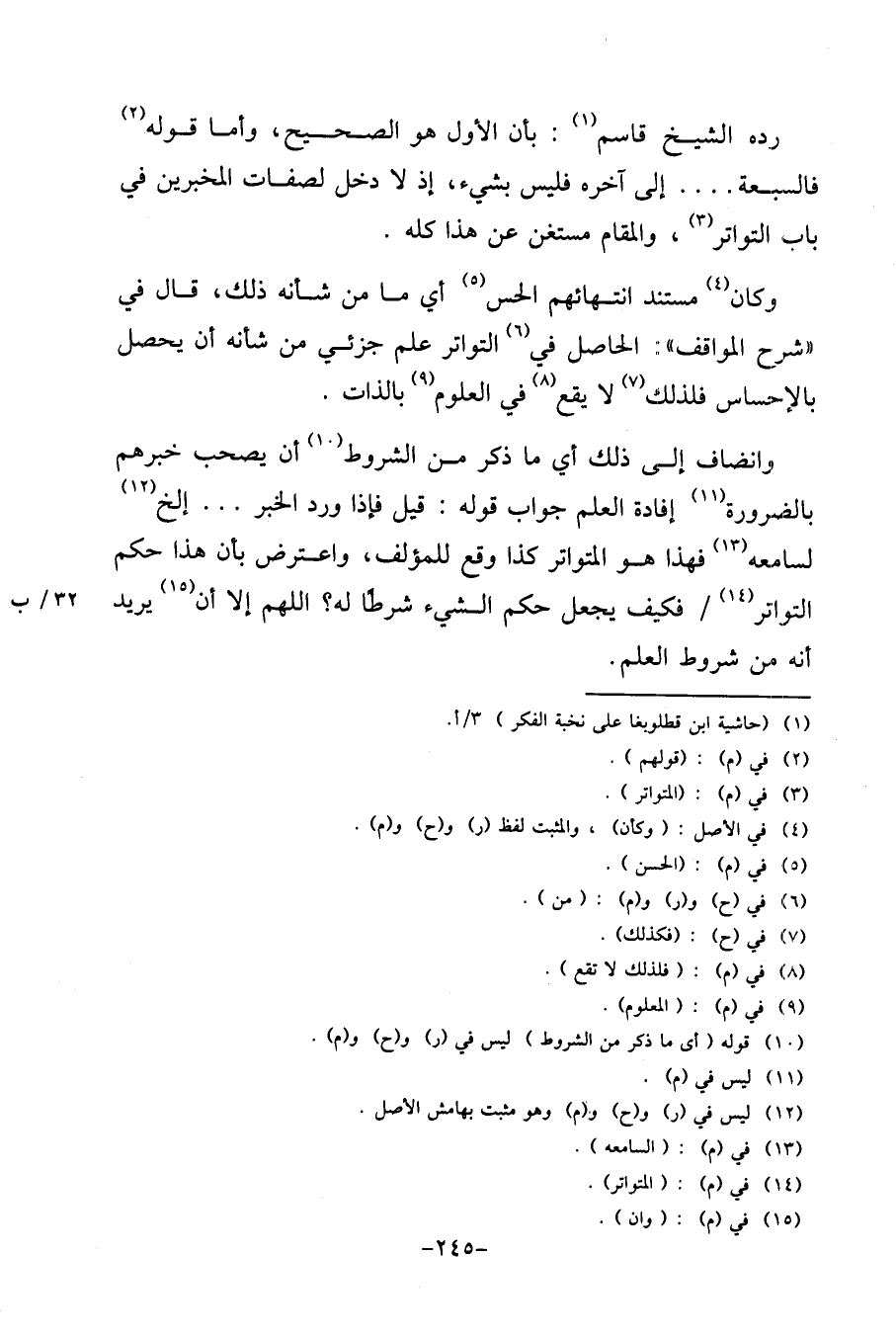 رده الشَّيْخ قَاسم: بِأَن الأول هُوَ الصَّحِيح، وَأما قَوْله فالسبعة ... ... إِلَى آخِره فَلَيْسَ بِشَيْء، إِذْ لَا دخل لصفات المخبرين فِي بَاب التَّوَاتُر، وَالْمقَام مستغن عَن هَذَا كُله.