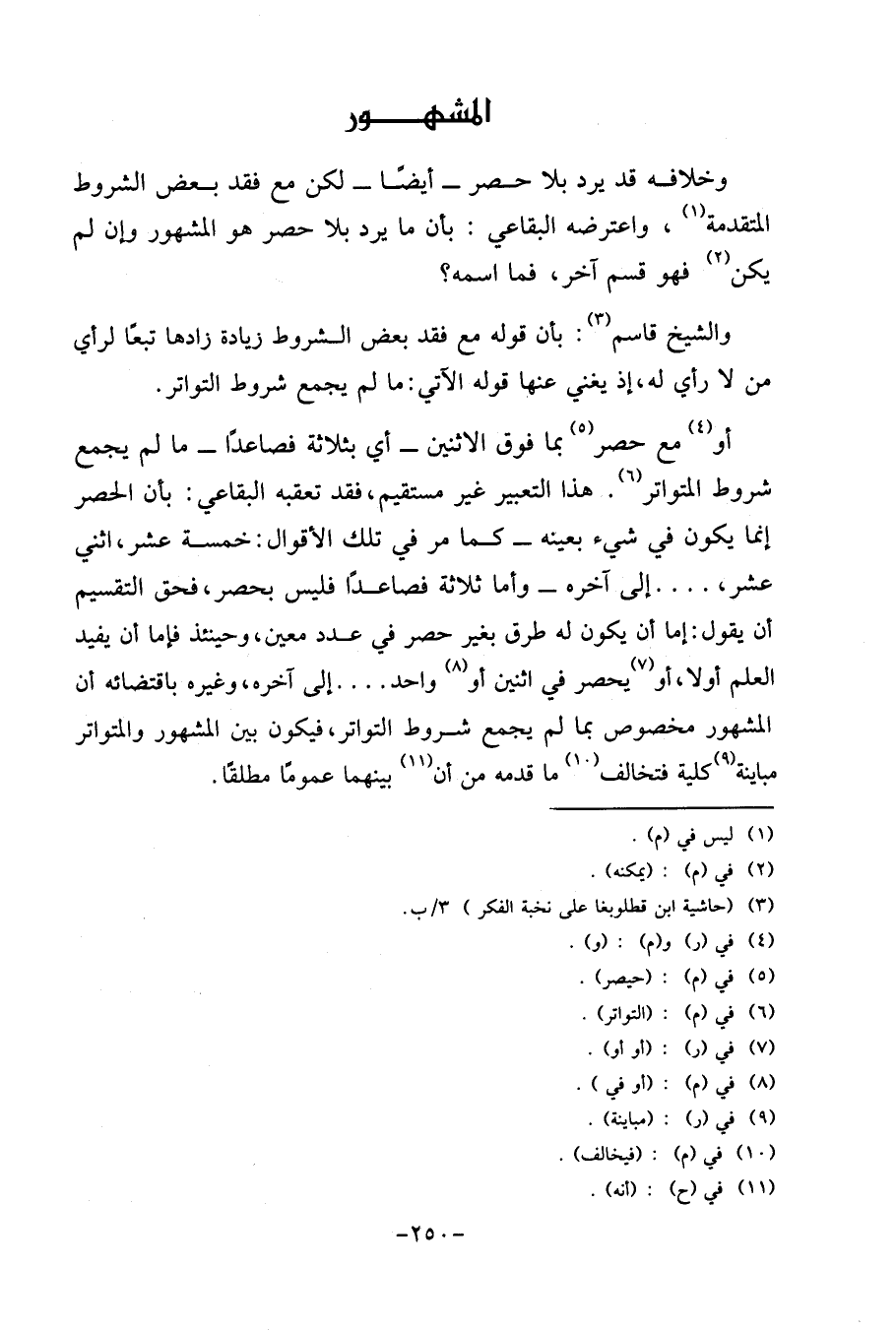 أَو مَعَ حصر بِمَا فَوق الِاثْنَيْنِ - أَي بِثَلَاثَة فَصَاعِدا - مَا لم يجمع شُرُوط الْمُتَوَاتر. هَذَا التَّعْبِير غير مُسْتَقِيم، فقد تعقبه البقاعي: بِأَن الْحصْر إِنَّمَا يكون فِي شَيْء بِعَيْنِه - كَمَا مر فِي تِلْكَ الْأَقْوَال: خَمْسَة عشر، اثْنَي عشر، ... ... إِلَى آخِره - وَأما ثَلَاثَة فَصَاعِدا فَلَيْسَ بحصر، فَحق التَّقْسِيم أَن يَقُول: إِمَّا أَن يكون لَهُ طرق بِغَيْر حصر فِي عدد معِين، وَحِينَئِذٍ فإمَّا أَن يُفِيد الْعلم أَولا، أَو يحصر فِي اثْنَيْنِ أَو وَاحِد ... ... إِلَى آخِره، وَغَيره باقتضائه أَن الْمَشْهُور مَخْصُوص بِمَا لم يجمع شُرُوط التَّوَاتُر، فَيكون بَين الْمَشْهُور والمتواتر مباينة كُلية فتخالف مَا قدمه من أَن بَينهمَا عُمُوما مُطلقًا.