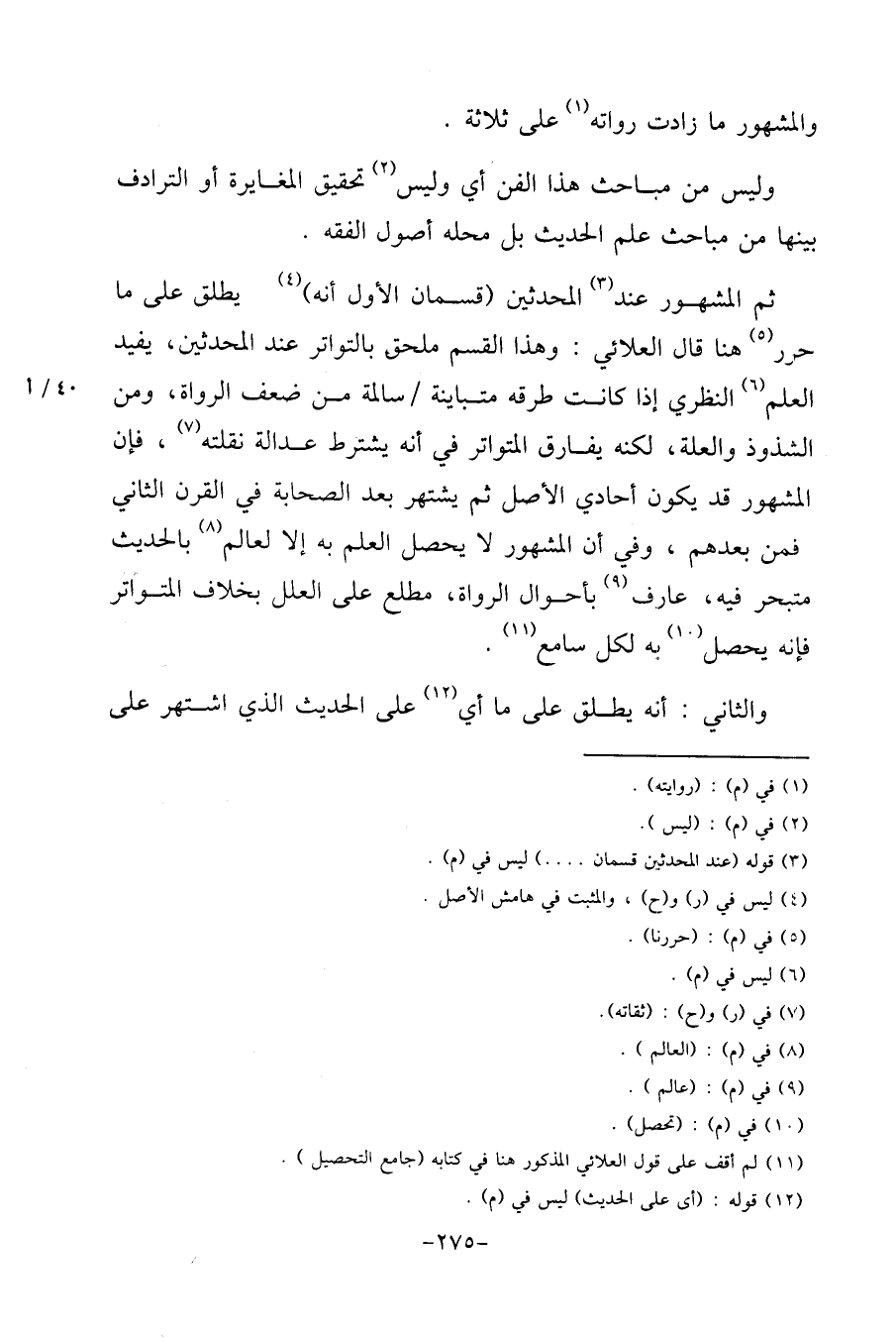 ثمَّ الْمَشْهُور عِنْد الْمُحدثين (قِسْمَانِ الأول أَنه) يُطلق على مَا حرر هُنَا قَالَ العلائي: وَهَذَا الْقسم مُلْحق بالتواتر عِنْد الْمُحدثين، يُفِيد الْعلم النظري إِذا كَانَت طرقه متباينة / سَالِمَة من ضعف الروَاة، وَمن الشذوذ وَالْعلَّة، لكنه يُفَارق الْمُتَوَاتر فِي أَنه يشْتَرط عَدَالَة نقلته، فَإِن الْمَشْهُور قد يكون أحادي الأَصْل ثمَّ يشْتَهر بعد الصَّحَابَة فِي الْقرن الثَّانِي فَمن بعدهمْ، وَفِي أَن الْمَشْهُور لَا يحصل الْعلم بِهِ إِلَّا لعالم بِالْحَدِيثِ متبحر فِيهِ، عَارِف بأحوال الروَاة، مطلع على الْعِلَل بِخِلَاف الْمُتَوَاتر فَإِنَّهُ يحصل بِهِ لكل سامع.