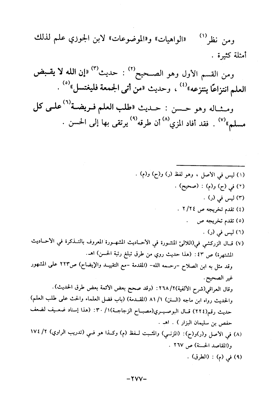 وَمن الْقسم الأول وَهُوَ الصَّحِيح: حَدِيث " إِن الله لَا يقبض الْعلم انتزاعاً ينتزعه "، وَحَدِيث " من أَتَى الْجُمُعَة فليغتسل ".