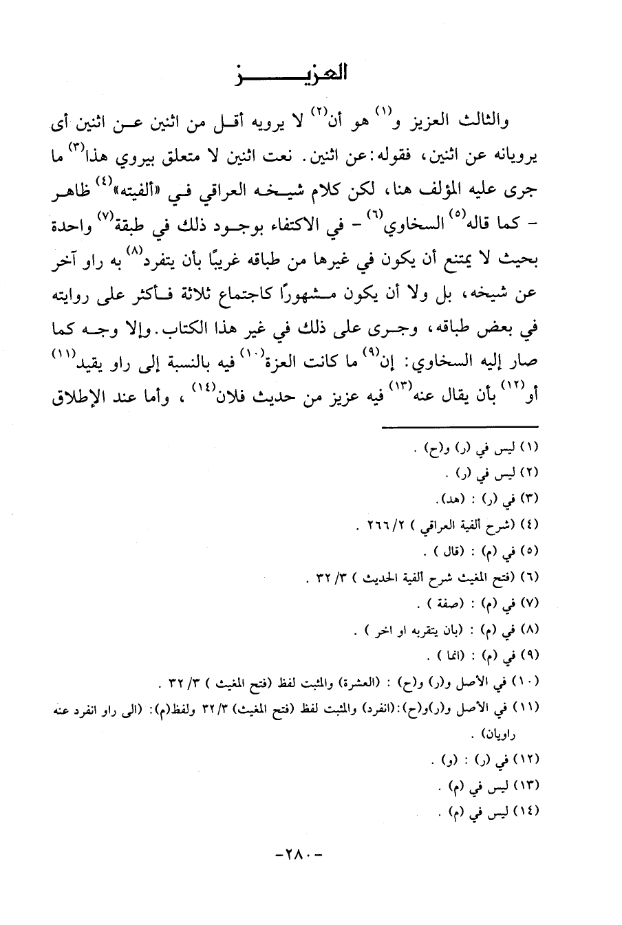 وَالثَّالِث الْعَزِيز وَهُوَ أَن لَا يرويهِ أقل من اثْنَيْنِ عَن اثْنَيْنِ أَي يرويانه عَن اثْنَيْنِ، فَقَوله: عَن اثْنَيْنِ. نعت اثْنَيْنِ لَا مُتَعَلق بيروي هَذَا مَا جرى عَلَيْهِ الْمُؤلف هُنَا، لَكِن كَلَام شَيْخه الْعِرَاقِيّ فِي " ألفيته " ظَاهر - كَمَا قَالَه السخاوي - فِي الِاكْتِفَاء بِوُجُود ذَلِك فِي طبقَة وَاحِدَة بِحَيْثُ لَا يمْتَنع أَن يكون فِي غَيرهَا من طباقه غَرِيبا بِأَن يتفرد بِهِ راو آخر عَن شَيْخه، بل وَلَا أَن يكون مَشْهُورا كاجتماع ثَلَاثَة فَأكْثر على رِوَايَته فِي بعض طباقه، وَجرى على ذَلِك فِي غير هَذَا الْكتاب. وَإِلَّا وَجه كَمَا صَار إِلَيْهِ السخاوي: إِن مَا كَانَت الْعِزَّة فِيهِ بِالنِّسْبَةِ إِلَى راو يُقيد أَو بِأَن يُقَال عَنهُ فِيهِ عَزِيز من حَدِيث فلَان، وَأما عِنْد الْإِطْلَاق