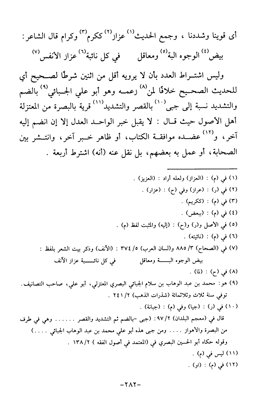 وَلَيْسَ اشْتِرَاط الْعدَد بِأَن لَا يرويهِ اقل من اثْنَيْنِ شرطا لصحيح أَي للْحَدِيث الصَّحِيح خلافًا لمن زَعمه وَهُوَ أَبُو عَليّ الجبائي بِالضَّمِّ وَالتَّشْدِيد نِسْبَة إِلَى جبى الْقصر وَالتَّشْدِيد قَرْيَة بِالْبَصْرَةِ من الْمُعْتَزلَة أهل الْأُصُول حَيْثُ قَالَ: لَا يقبل خبر الْوَاحِد الْعدْل إِلَّا إِن انْضَمَّ إِلَيْهِ آخر، وعضده مُوَافقَة الْكتاب، أَو ظَاهر خبر آخر، وانتشر بَين الصَّحَابَة، أَو عمل بِهِ بَعضهم، بل نقل عَنهُ (أَنه) اشْترط أَرْبَعَة.