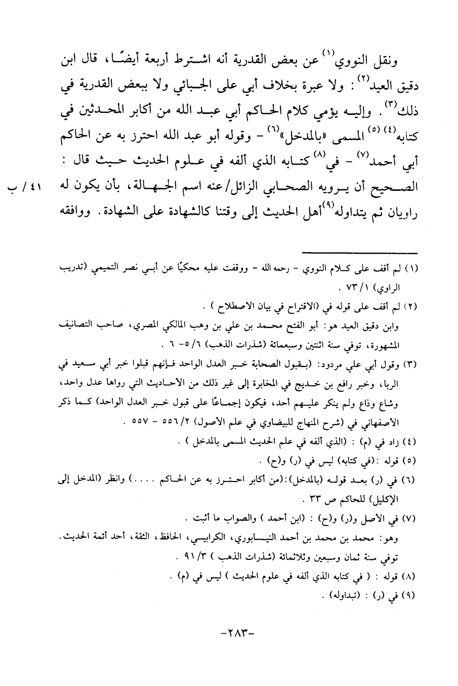 وَنقل النَّوَوِيّ عَن بعض الْقَدَرِيَّة أَنه اشْترط أَرْبَعَة أَيْضا، قَالَ ابْن دَقِيق الْعِيد: وَلَا عِبْرَة بِخِلَاف أبي على الجبائي وَلَا بِبَعْض الْقَدَرِيَّة فِي ذَلِك. وَإِلَيْهِ يؤمي كَلَام الْحَاكِم أبي عبد الله من أكَابِر الْمُحدثين فِي كِتَابه الْمُسَمّى " بالمدخل " - وَقَوله أَبُو عبد الله احْتَرز بِهِ عَن الْحَاكِم أبي أَحْمد - فِي كِتَابه الَّذِي أَلفه فِي عُلُوم الحَدِيث حَيْثُ قَالَ: الصَّحِيح أَن يرويهِ الصَّحَابِيّ الزائل / عَنهُ اسْم الْجَهَالَة، بِأَن يكون لَهُ راويان ثمَّ يتداوله أهل الحَدِيث إِلَى وقتنا كَالشَّهَادَةِ على الشَّهَادَة. وَوَافَقَهُ
