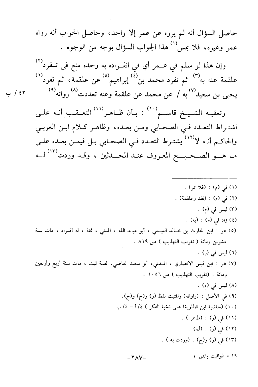 وَإِن هَذَا لَو سلم فِي عمر أَي فِي انْفِرَاده بِهِ وَحده منع فِي تفرد عَلْقَمَة عَنهُ بِهِ ثمَّ تفرد مُحَمَّد بن إِبْرَاهِيم عَن عَلْقَمَة، ثمَّ تفرد يحيى بن سعيد بِهِ / عَن مُحَمَّد عَن عَلْقَمَة وَعنهُ تعدّدت رُوَاته.