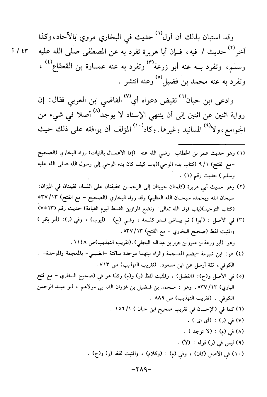 وَقد استبان بذلك أَن أول حَدِيث فِي البُخَارِيّ مَرْوِيّ بالآحاد، وَكَذَا آخر حَدِيث / فِيهِ، فَإِن أَبَا هُرَيْرَة تفرد بِهِ عَن الْمُصْطَفى، وَتفرد بِهِ عَنهُ أَبُو زرْعَة وَتفرد بِهِ عَنهُ عمَارَة بن الْقَعْقَاع، وَتفرد بِهِ عَنهُ مُحَمَّد بن فُضَيْل وَعنهُ انْتَشَر.