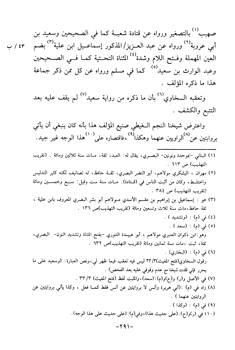 صُهَيْب بِالتَّصْغِيرِ وَرَوَاهُ عَن قَتَادَة شُعْبَة كَمَا فِي الصَّحِيحَيْنِ وَسَعِيد بن أبي عرُوبَة وَرَوَاهُ عَن عبد الْعَزِيز / الْمَذْكُور إِسْمَاعِيل ابْن علية بِضَم الْعين الْمُهْملَة وَفتح اللَّام وَشدَّة الْمُثَنَّاة التَّحْتِيَّة كَمَا فِي الصَّحِيحَيْنِ وَعبد الْوَارِث بن سعيد كَمَا فِي مُسلم وَرَوَاهُ عَن كل مِمَّن ذكر جمَاعَة هَذَا مَا ذكره الْمُؤلف.