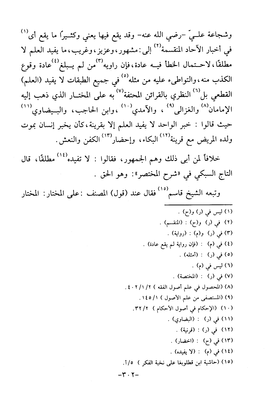 وشجاعة عَليّ - رَضِي الله عَنهُ - وَقد يَقع فِيهَا يَعْنِي وَكَثِيرًا مَا يَقع أَي فِي أَخْبَار الْآحَاد المنقسمة إِلَى: مَشْهُور، وعزيز، وغريب، مَا يُفِيد الْعلم لَا مُطلقًا، لاحْتِمَال الْخَطَأ فِيهِ عَادَة، فَإِن رَاوِيه من لم يبلغ عَادَة وُقُوع الْكَذِب مِنْهُ، والتواطىء عَلَيْهِ من مثله فِي جَمِيع الطَّبَقَات لَا يُفِيد (الْعلم) الْقطعِي بل النظري بالقرائن المحتفة بِهِ على الْمُخْتَار الَّذِي ذهب إِلَيْهِ الإمامان والغزالى، والآمدي، وَابْن الْحَاجِب، والبيضاوي حَيْثُ قَالُوا: خبر الْوَاحِد لَا يُفِيد الْعلم إِلَّا بِقَرِينَة، كَأَن يخبر إِنْسَان بِمَوْت وَلَده الْمَرِيض مَعَ قرينَة الْبكاء، وإحضار الْكَفَن والنعش.