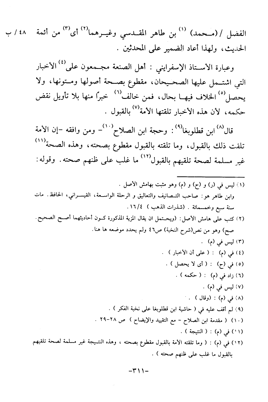 قَالَ ابْن قطلوبغا: وَحجَّة ابْن الصّلاح - وَمن وَافقه - إِن الْأمة تلقت ذَلِك بِالْقبُولِ، وَمَا تَلَقَّتْهُ بِالْقبُولِ مَقْطُوع بِصِحَّتِهِ، وَهَذِه الصِّحَّة غير مسلمة لصِحَّة تلقيهم بِالْقبُولِ مَا غلب على ظنهم صِحَّته. قَوْله: