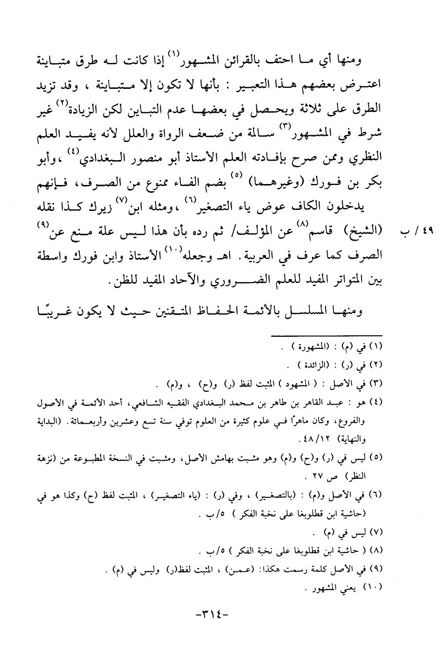وَمِنْهَا أَي مَا احتف بالقرائن الْمَشْهُور إِذا كَانَت لَهُ طرق متباينة اعْترض بَعضهم هَذَا التَّعْبِير: بِأَنَّهَا لَا يكون إِلَّا متباينة، وَقد تزيد الطّرق على ثَلَاثَة وَيحصل فِي بَعْضهَا عدم التباين لَكِن الزِّيَادَة غير شَرط فِي الْمَشْهُور سَالِمَة من ضعف الروَاة والعلل لِأَنَّهُ يُفِيد الْعلم النظري وَمِمَّنْ صرح بإفادته الْعلم الْأُسْتَاذ أَبُو مَنْصُور الْبَغْدَادِيّ، وَأَبُو بكر بن فورك (وَغَيرهمَا) بِضَم الْفَاء مَمْنُوع من الصّرْف، فَإِنَّهُم يدْخلُونَ الْكَاف عوض يَاء التصغير، وَمثله ابْن زيرك كَذَا نَقله (الشَّيْخ) قَاسم عَن الْمُؤلف / ثمَّ رده بِأَن هَذَا لَيْسَ عِلّة منع عَن الصّرْف كَمَا عرف فِي الْعَرَبيَّة. اه وَجعله الْأُسْتَاذ وَابْن فورك وَاسِطَة بَين الْمُتَوَاتر الْمُفِيد للْعلم الضَّرُورِيّ والآحاد الْمُفِيد للظن.
