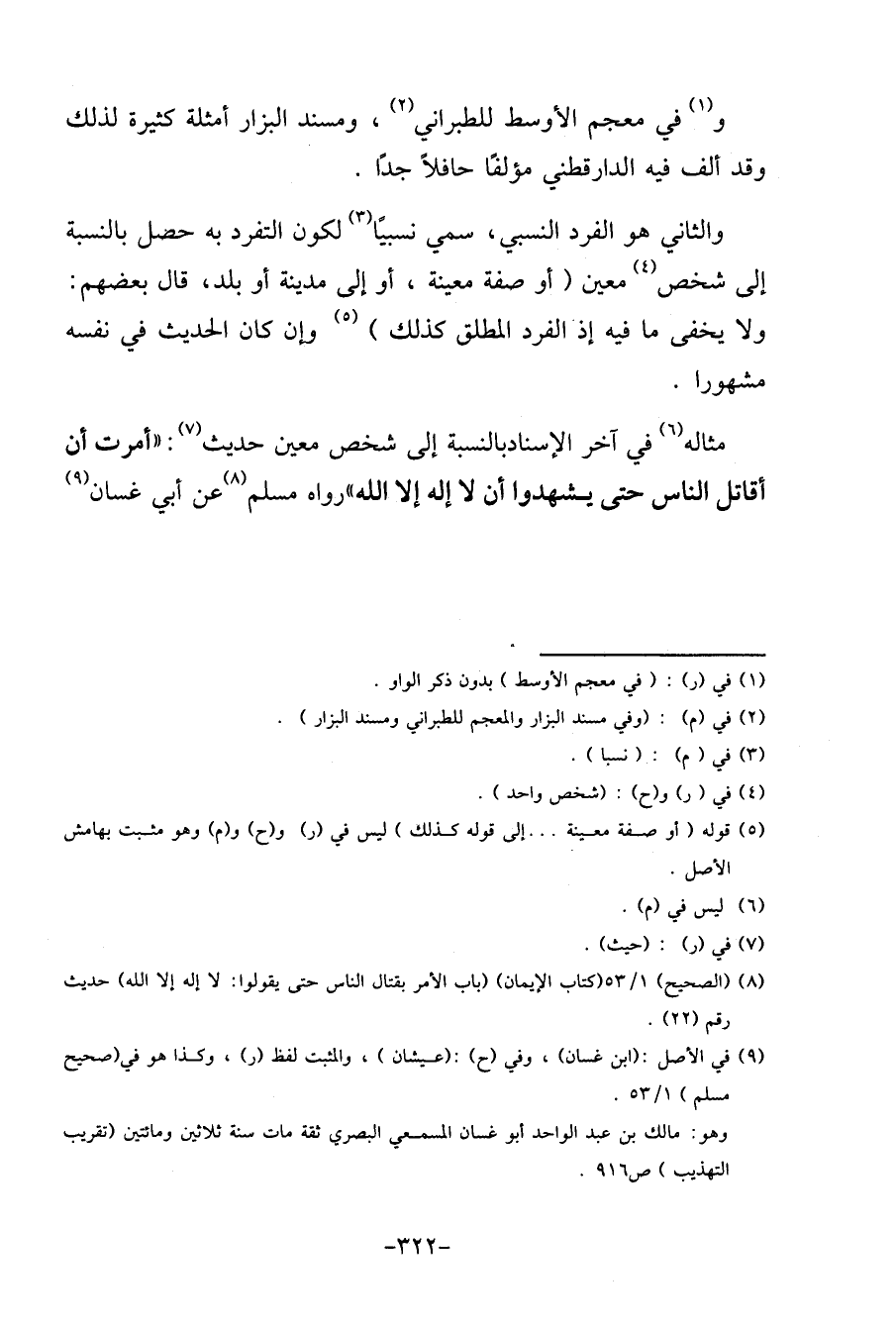 مِثَاله فِي آخر الْإِسْنَاد بِالنِّسْبَةِ إِلَى شخص معِين حَدِيث: " أمرت أَن أقَاتل النَّاس حَتَّى يشْهدُوا أَن لَا إِلَه إِلَّا الله " رَوَاهُ مُسلم عَن أبي غَسَّان