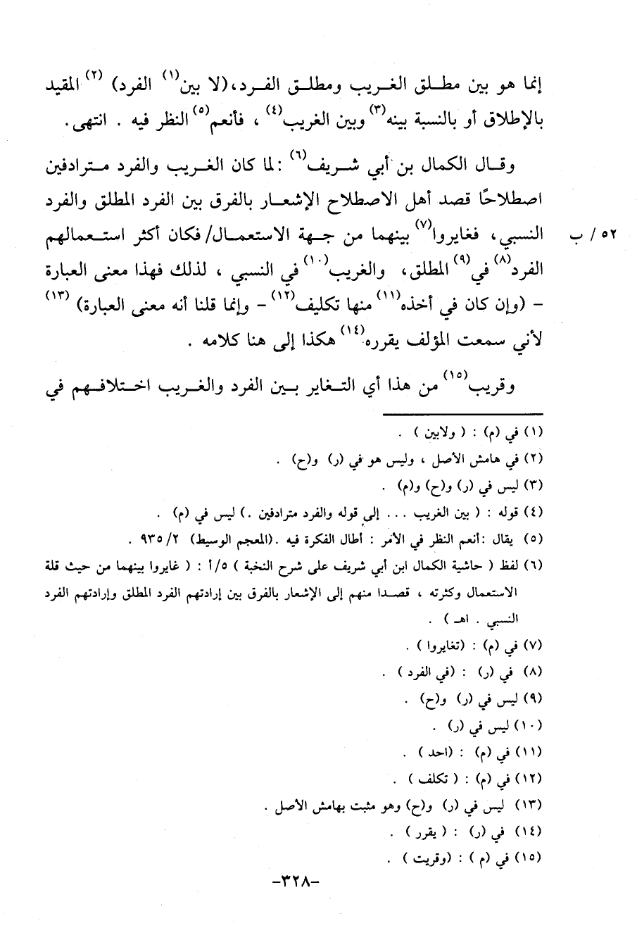 وَقَالَ الْكَمَال بن أبي شرِيف: لما كَانَ الْغَرِيب والفرد مترادفين اصْطِلَاحا قصد أهل الِاصْطِلَاح الْإِشْعَار بِالْفرقِ بَين الْفَرد الْمُطلق والفرد النسبي، فغايروا بَينهمَا من جِهَة الِاسْتِعْمَال / فَكَانَ أَكثر استعمالهم الْفَرد فِي الْمُطلق، والغريب فِي النسبي، لذَلِك فَهَذَا معنى الْعبارَة - (وَإِن كَانَ فِي أَخذه مِنْهَا تَكْلِيف - وَإِنَّمَا قُلْنَا أَنه معنى الْعبارَة) لِأَنِّي سَمِعت الْمُؤلف يقرره هَكَذَا إِلَى هُنَا كَلَامه.