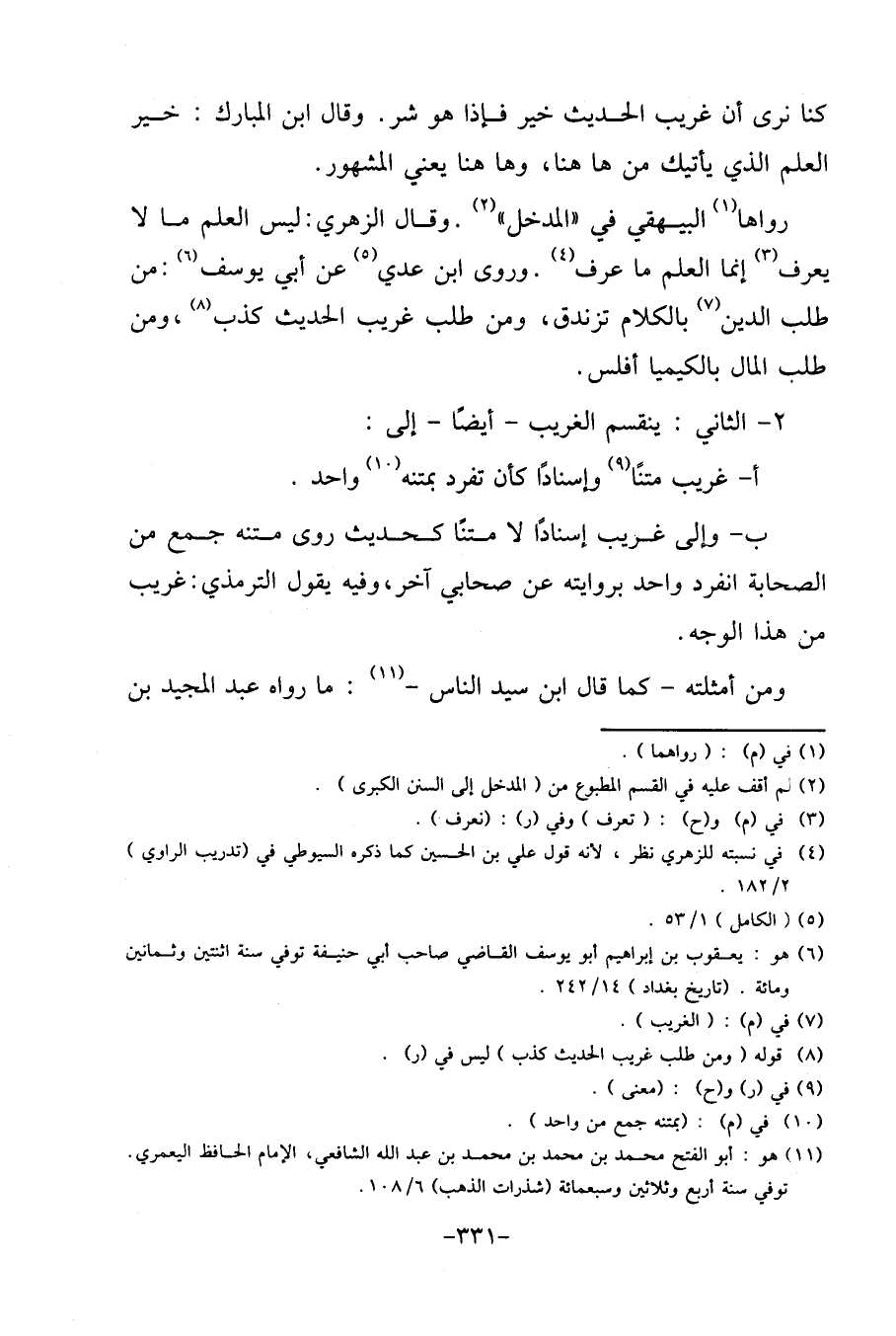 كُنَّا نرى أَن غَرِيب الحَدِيث خير فَإِذا هُوَ شَرّ. وَقَالَ ابْن الْمُبَارك: خير الْعلم الَّذِي يَأْتِيك من هَا هُنَا، وَهَا هُنَا يَعْنِي الْمَشْهُور.
