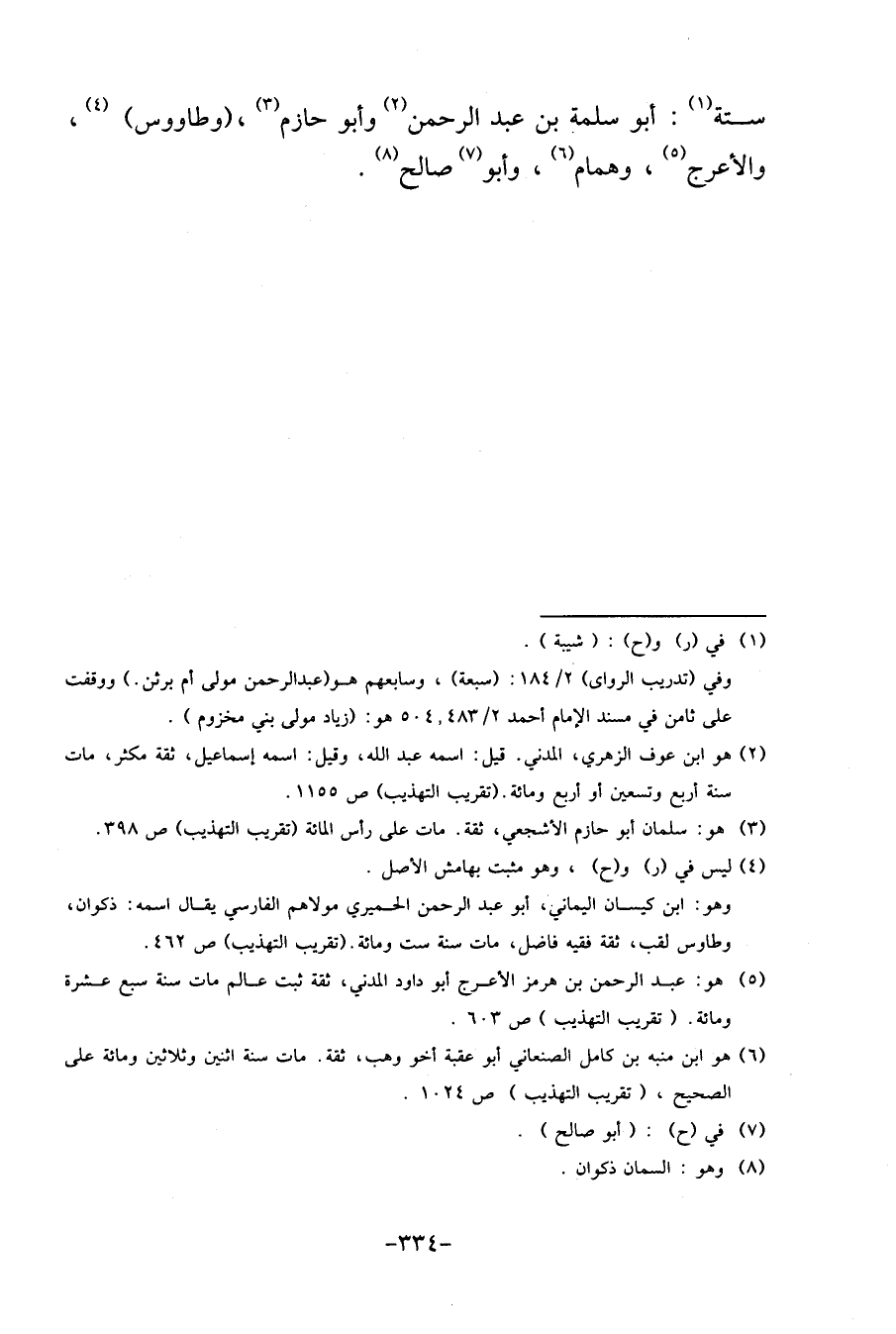 سِتَّة: أَبُو سَلمَة بن عبد الرَّحْمَن وَأَبُو حَازِم، (طَاوُوس) ، والأعرج، وَهَمَّام، وَأَبُو صَالح.