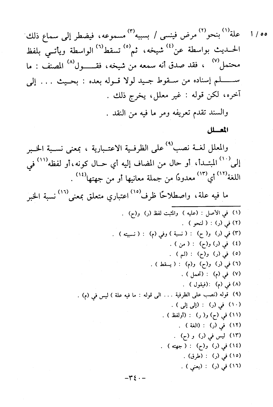 عِلّة بِنَحْوِ مرض فينسى / بِسَبَبِهِ مسموعه، فيضطر إِلَى سَماع ذَلِك الحَدِيث بِوَاسِطَة عَن شَيْخه، ثمَّ تسْقط الْوَاسِطَة وَيَأْتِي بِلَفْظ مُحْتَمل، فقد صدق أَنه سَمعه من شَيْخه، فَقَوْل المُصَنّف: مَا سلم إِسْنَاده من سُقُوط جيد لَوْلَا قَوْله بعده: بِحَيْثُ ... إِلَى آخِره، لَكِن قَوْله: غير مُعَلل، يخرج ذَلِك والسند تقدم تَعْرِيفه وَمر مَا فِيهِ من النَّقْد.