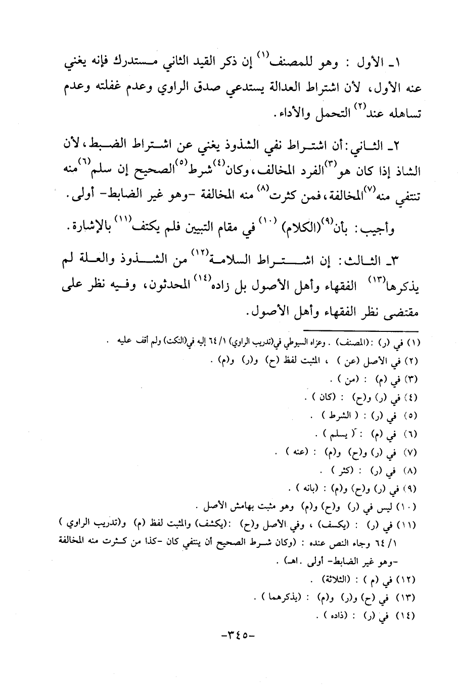 3 - الثَّالِث: إِن اشْتِرَاط السَّلامَة من الشذوذ وَالْعلَّة لم يذكرهَا الْفُقَهَاء وَأهل الْأُصُول بل زَاده المحدثون، وَفِيه نظر على مُقْتَضى نظر الْفُقَهَاء وَأهل الْأُصُول.