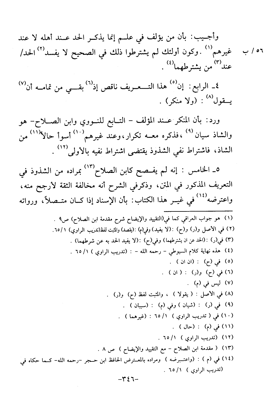 - الْخَامِس: إِنَّه لم يفصح كَابْن الصّلاح بمراده من الشذوذ فِي التَّعْرِيف الْمَذْكُور فِي الْمَتْن، وَذكر فِي الشَّرْح أَنه مُخَالفَة الثِّقَة لأرجح مِنْهُ، وَاعْتَرضهُ فِي غير هَذَا الْكتاب: بِأَن الْإِسْنَاد إِذا كَانَ مُتَّصِلا، وَرُوَاته