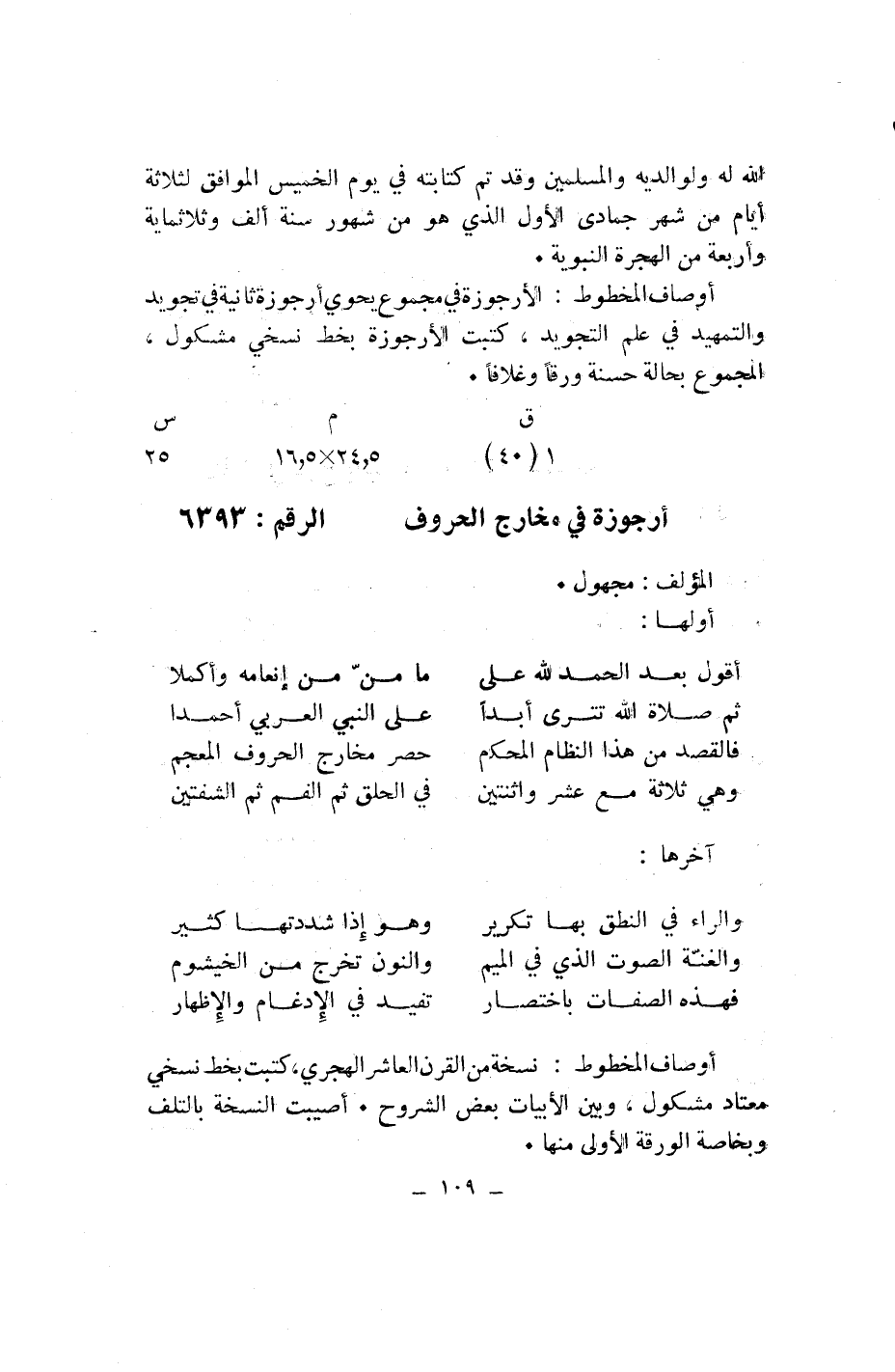 أوصاف المخطوط: الأرجوزة في مجموع يحوي أرجوزة ثانية في تجويد والتمهيد في علم التجويد، كتبت الأرجوزة بخط نسخي مشكول، المجموع بحالة حسنة ورقا وغلافا.