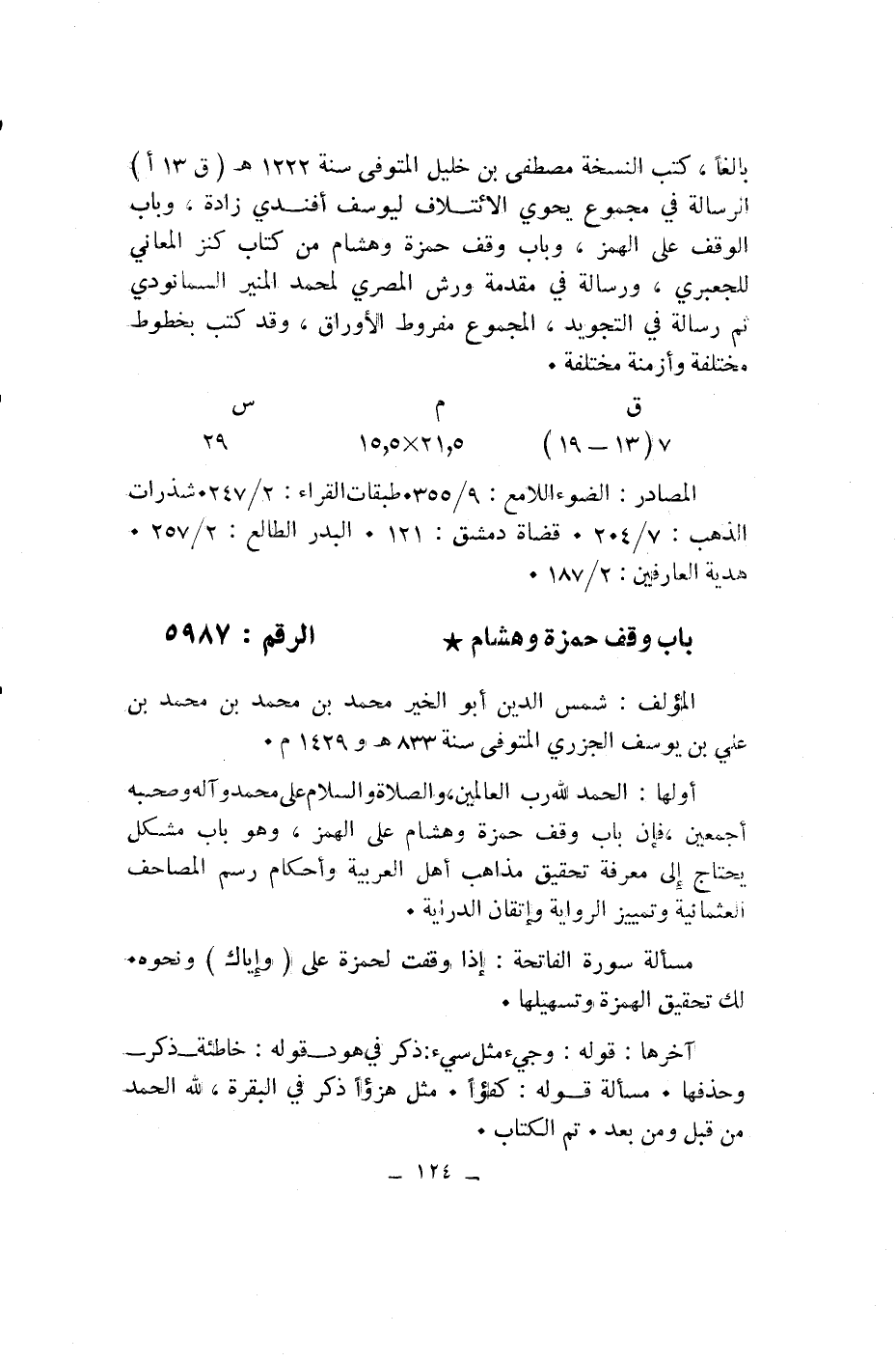 بالغا، كتب النسخة مصطفى بن خليل المتوفى سنة 1222 هـ (ق 13 أ) الرسالة في مجموع يحوي الائتلاف ليوسف أفندي زادة، وباب الوقف على الهمز، وباب وقف حمزة وهشام من كتاب كنز المعاني للجعبري، ورسالة في مقدمة ورش المصري لمحمد المنير السمانودي ثم رسالة في التجويد، المجموع مفروط الأوراق، وقد كتب بخطوط مختلفة وأزمنة مختلفة.