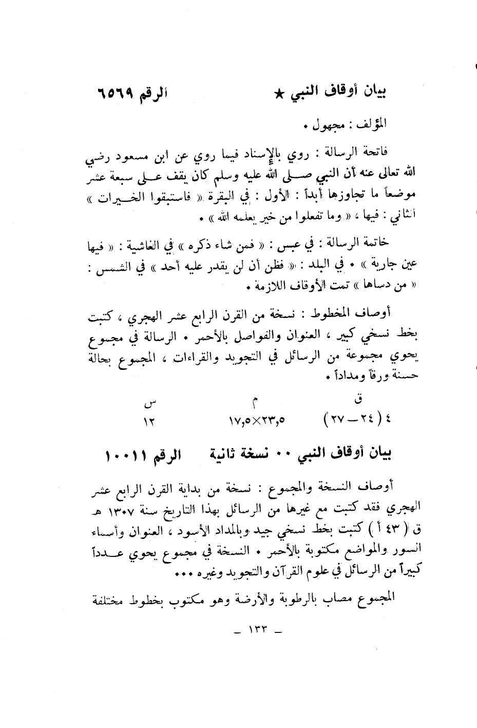 أوصاف النسخة والمجموع: نسخة من بداية القرن الرابع عشر الهجري فقد كتبت مع غيرها من الرسائل بهذا التاريخ سنة 1307 هـ ق (43 أ) كتبت بخط نسخي جيد وبالمداد الأسود، العنوان وأسماء السور والمواضع مكتوبة بالأحمر. النسخة في مجموع يحوي عددا كبيرا من الرسائل في علوم القرآن والتجويد وغيره ...