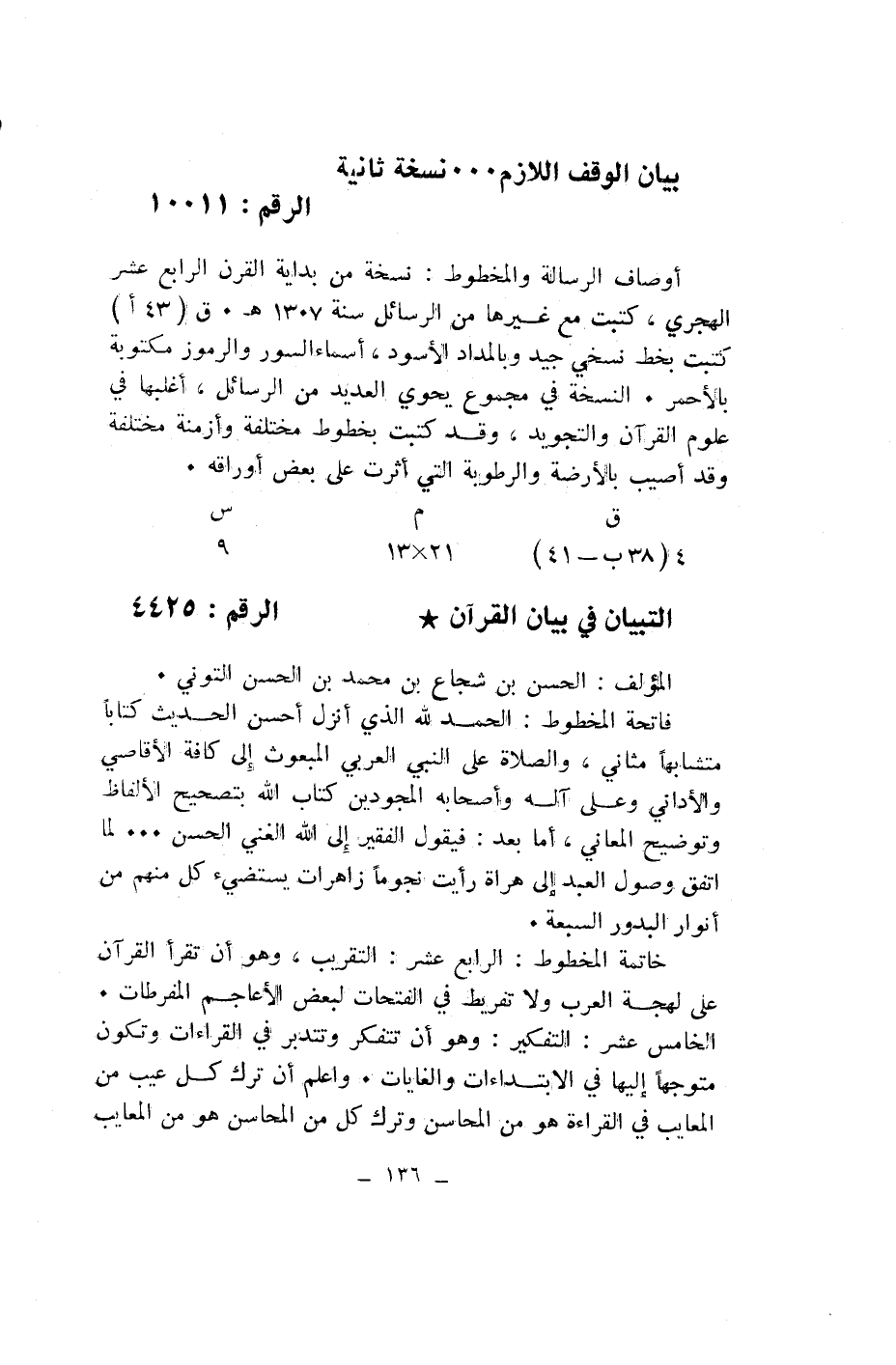 أوصاف الرسالة والمخطوط: نسخة من بداية القرن الرابع عشر الهجري، كتبت مع غيرها من الرسائل سنة 1307 هـ. ق (43 أ) كتبت بخط نسخي جيد وبالمداد الأسود، أسماء السور والرموز مكتوبة بالأحمر. النسخة في مجموع يحوي العديد من الرسائل، أغلبها في علوم القرآن والتجويد، وقد كتبت بخطوط مختلفة وأزمنة مختلفة وقد أصيب بالأرضة والرطوبة التي أثرت على بعض أوراقه.