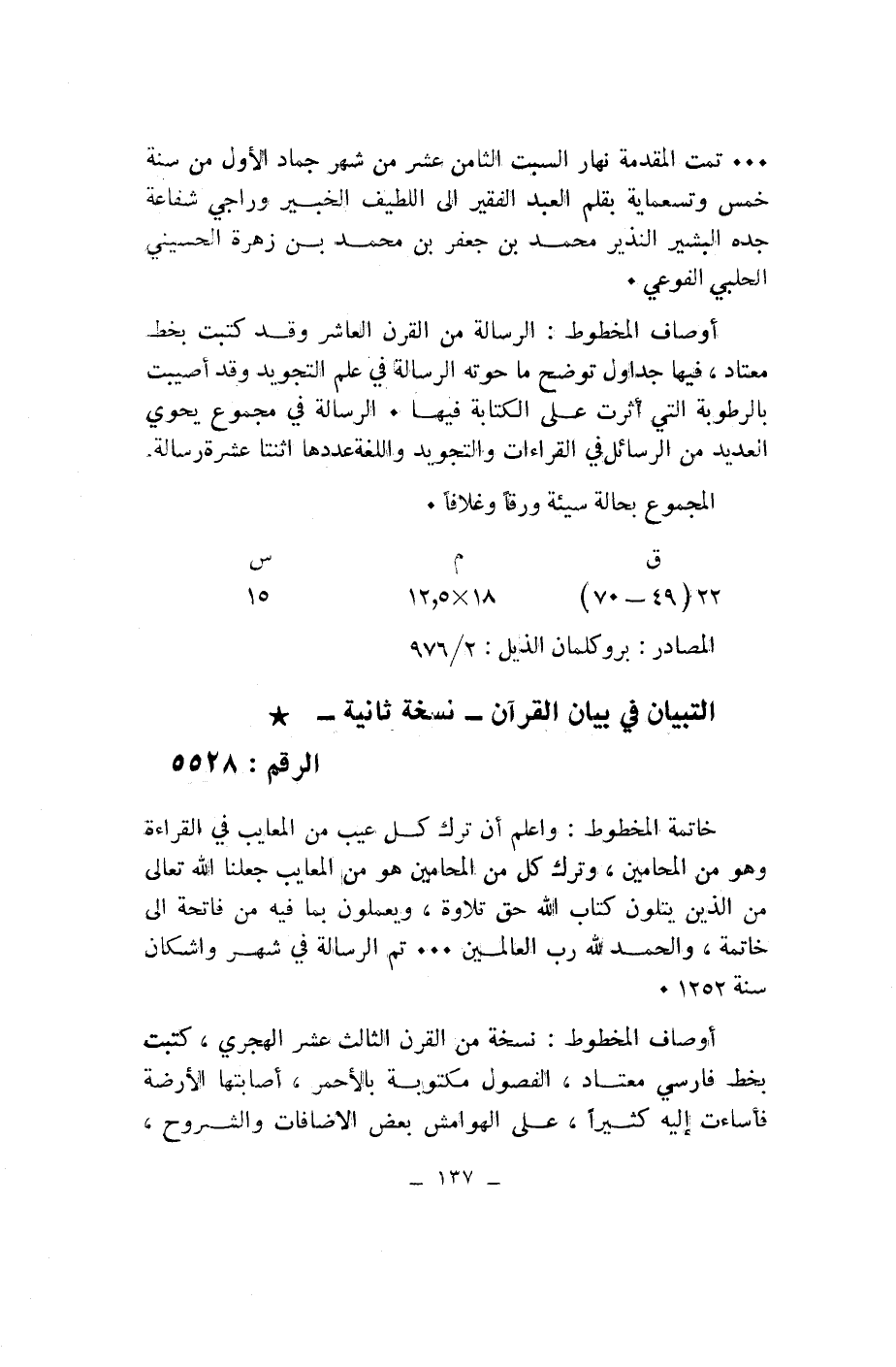 خاتمة المخطوط: واعلم أن ترك كل عيب من المعايب في القراءة وهو من المحامين، وترك كل من المحامين هو من المعايب جعلنا الله تعالى من الذين يتلون كتاب الله حق تلاوة، ويعملون بما فيه من فاتحة الى خاتمة، والحمد لله رب العالمين ... تم الرسالة في شهر واشكان سنة 1252.