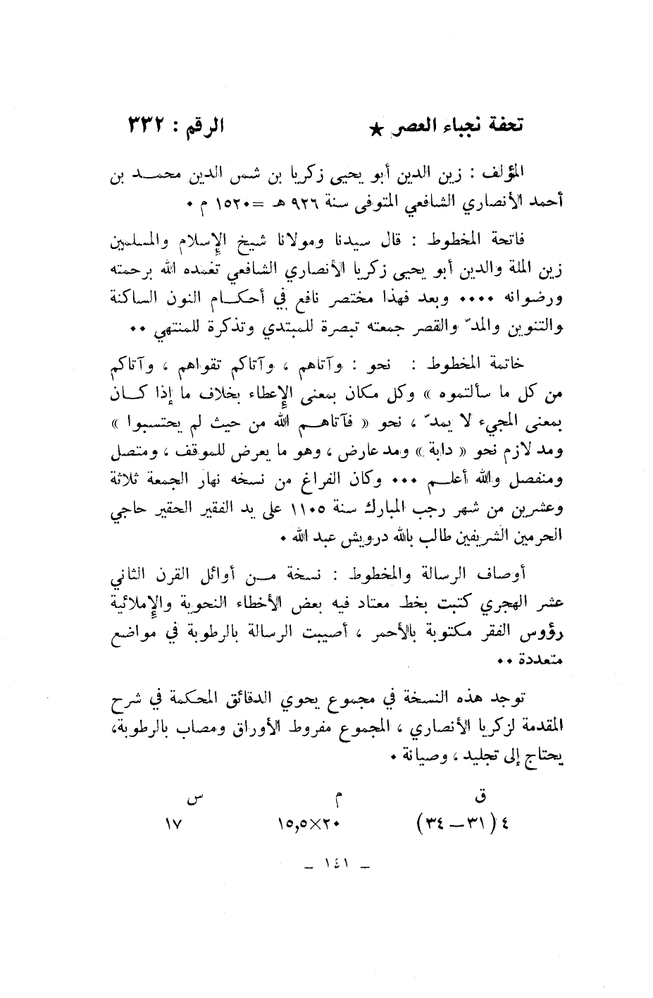 المؤلف: زين الدين أبو يحيى زكريا بن شمس الدين محمد بن أحمد الأنصاري الشافعي المتوفى سنة 926 هـ- 1520 م.