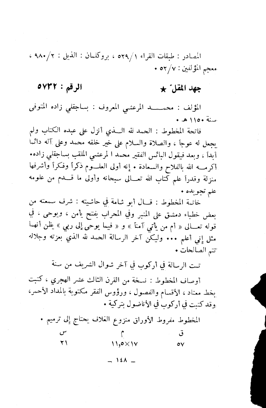 المؤلف: محمد المرعشي المعروف: بساجقلي زاده المتوفى سنة 1150 هـ.